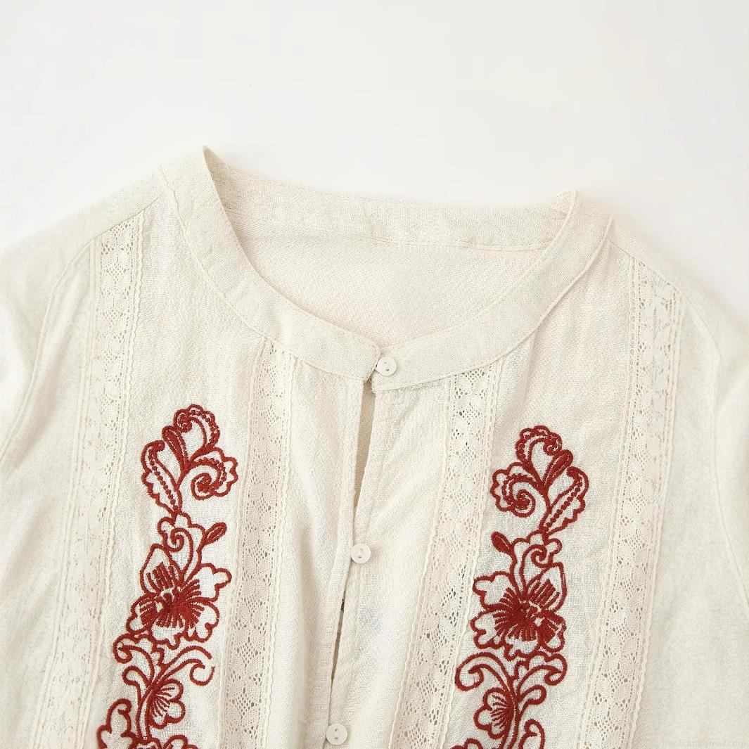 Women's Bohemian Ethnic Floral Embroidery Blouse Vintage Round Neck Lantern Sleeve Lace Patchwork Drawstring Waist Peplum Shirt Top