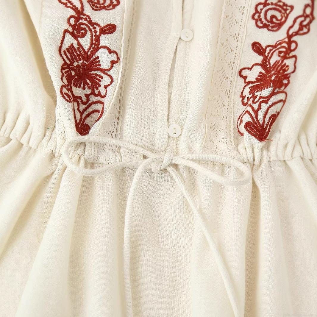Embroidery, Drawstring, Lace Patchwork, Lantern Sleeves, Red Floral Embroidery, Ruffled Hem
