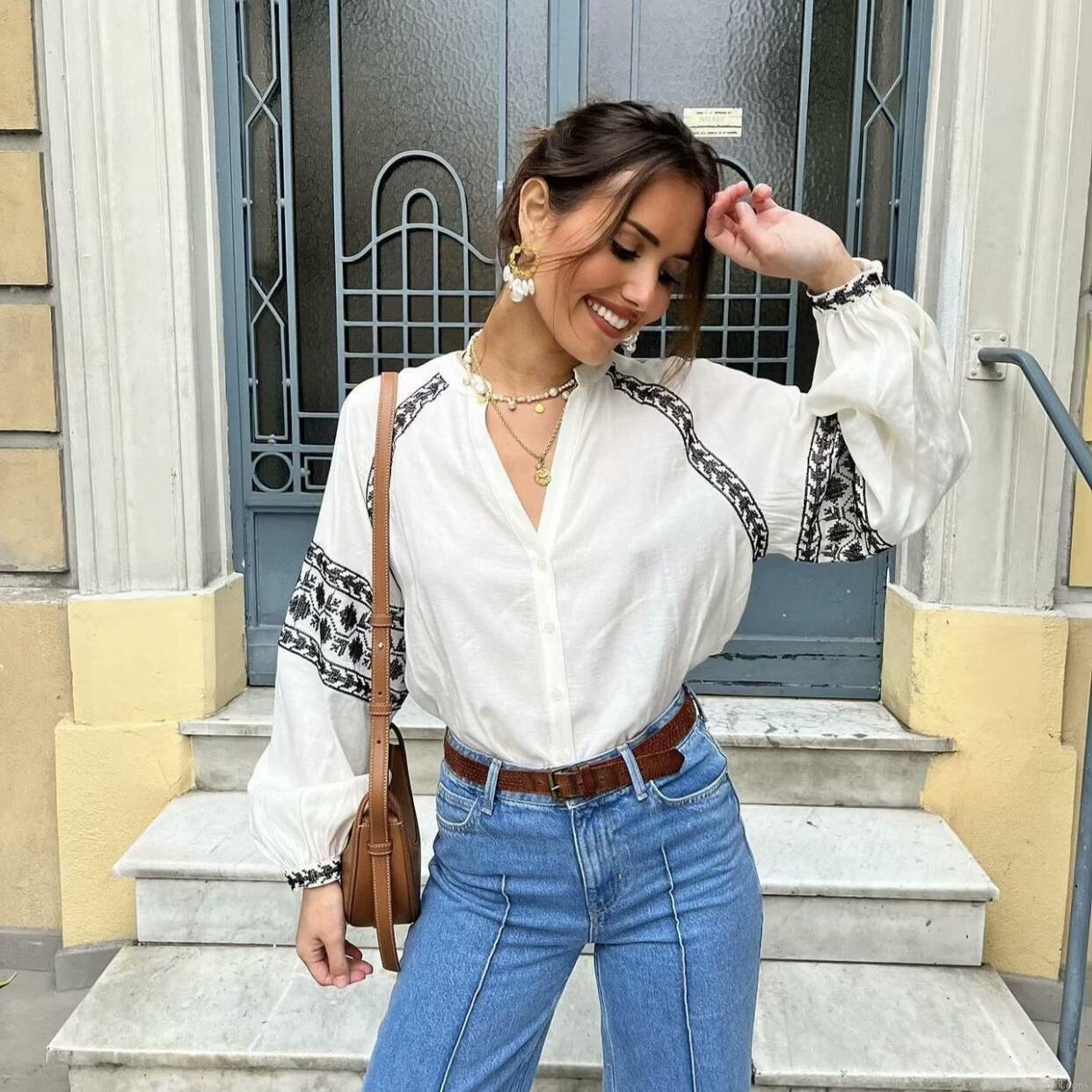 • Women's Bohemian Ethnic Geometric Embroidery Blouse 100% Polyester Long Sleeve V Neck Single Breasted Loose Casual Vacation Top For Ladies