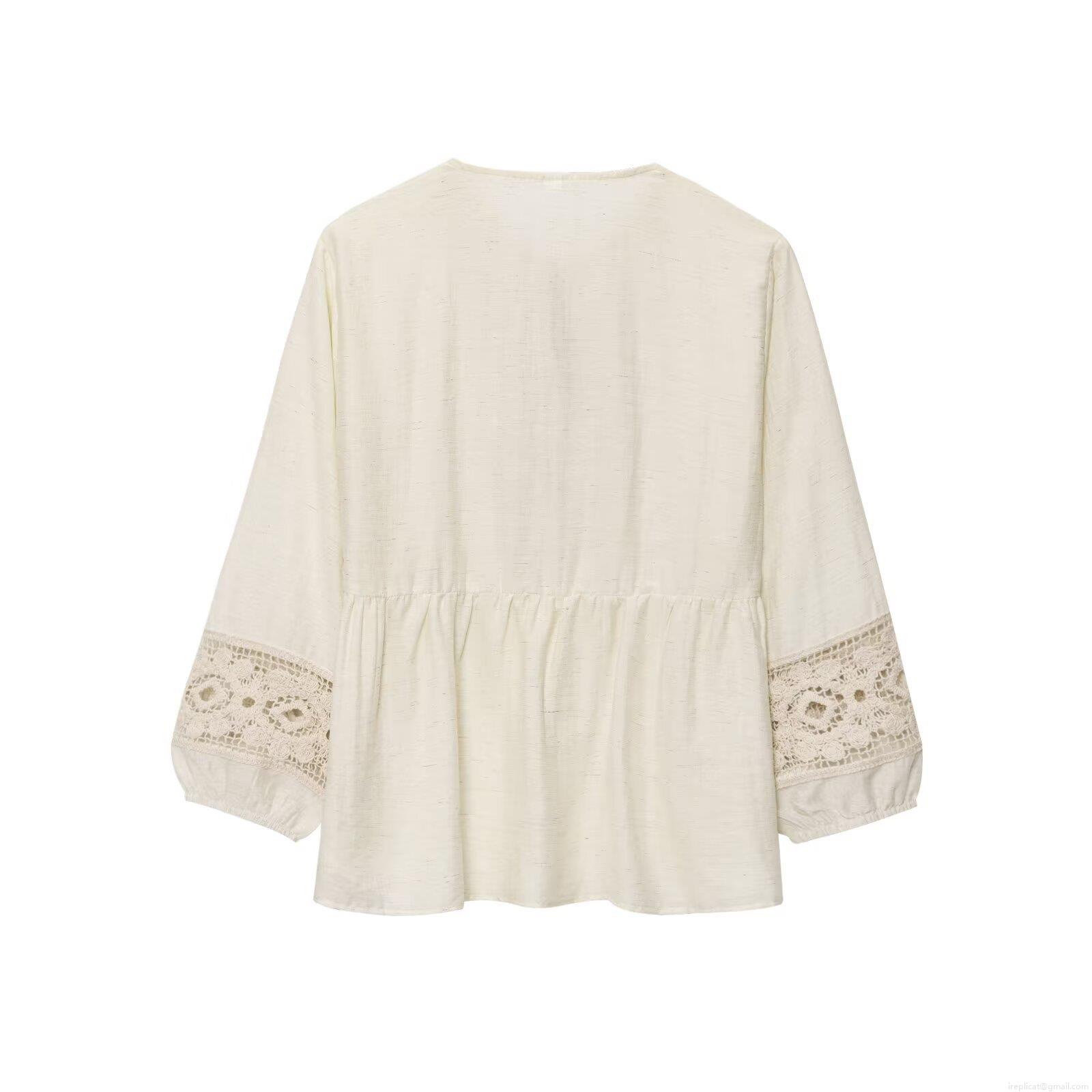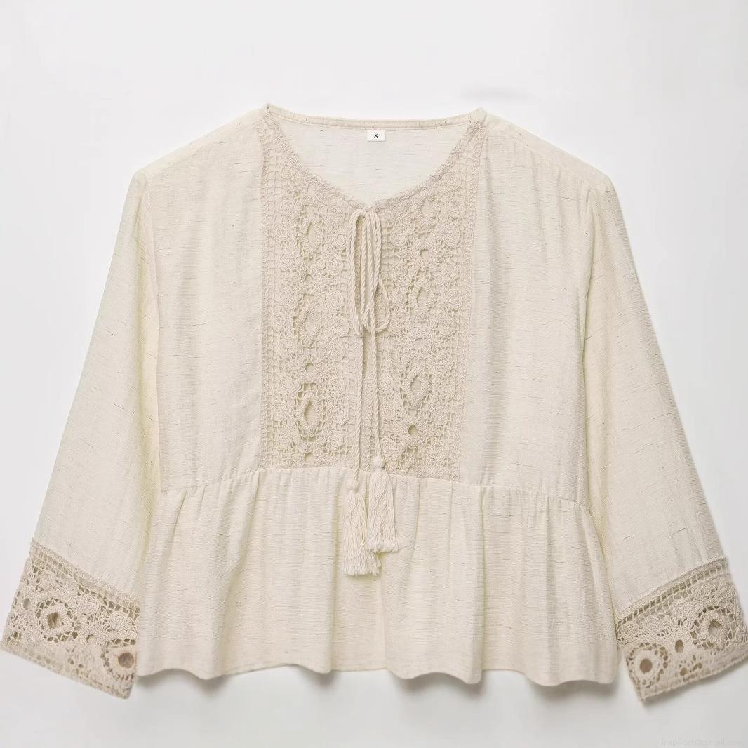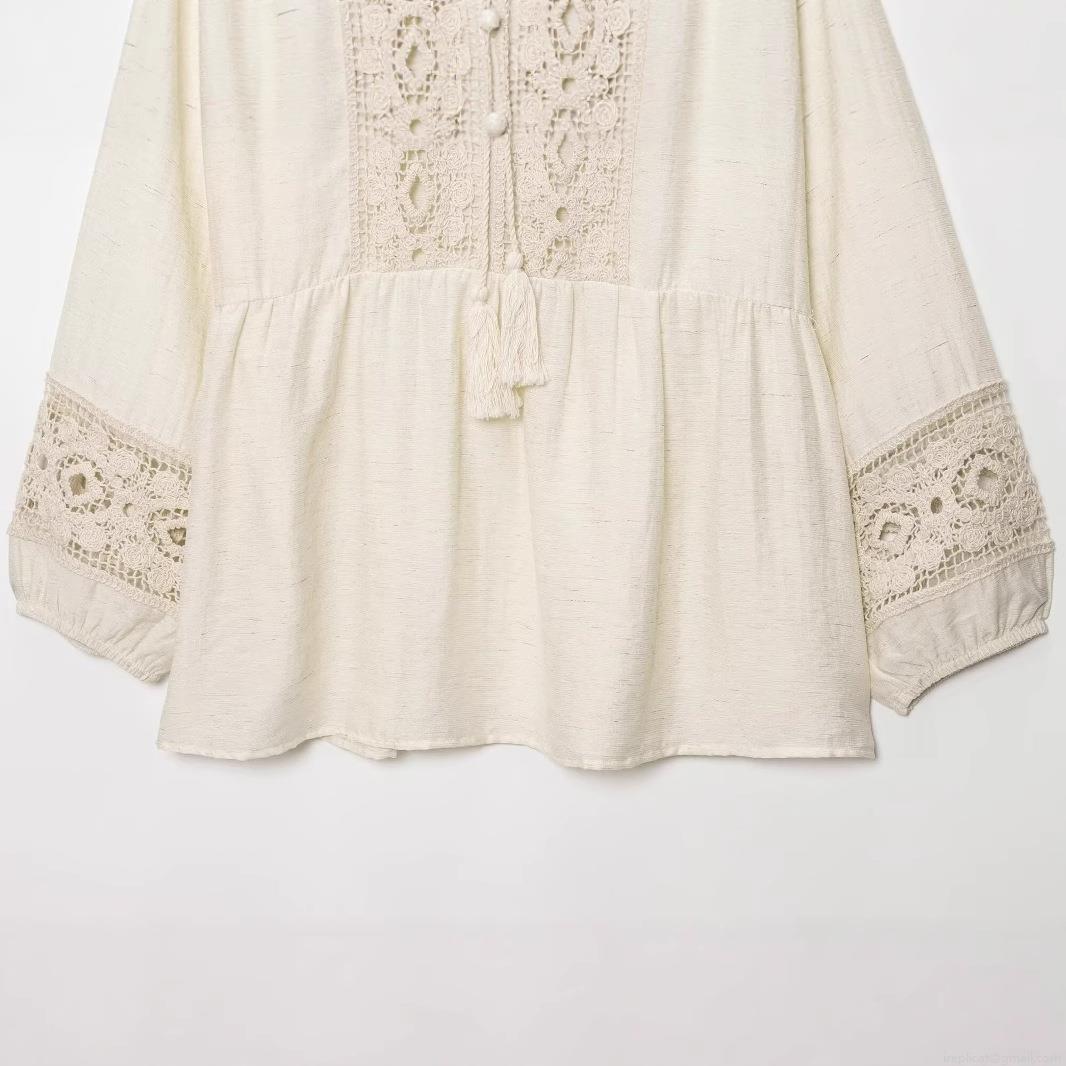 • Women's Bohemian Lace Crochet Blouse Splice Long Sleeve Shirt Tassel V-Neck Cotton Linen Blend Top Vacation Casual Elegant Apparel Ladies Clothing