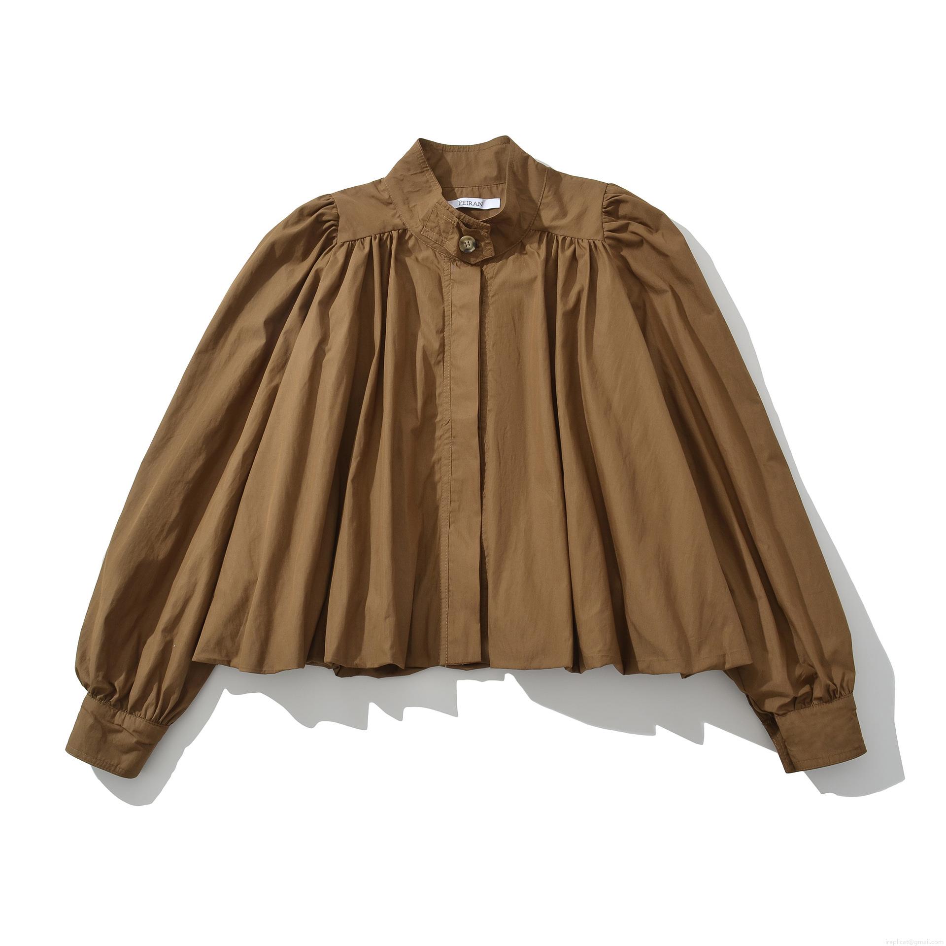 Solid Color, Pleats, Stand-up Collar, Puff Sleeves, Lantern Sleeves, Dropped Shoulders