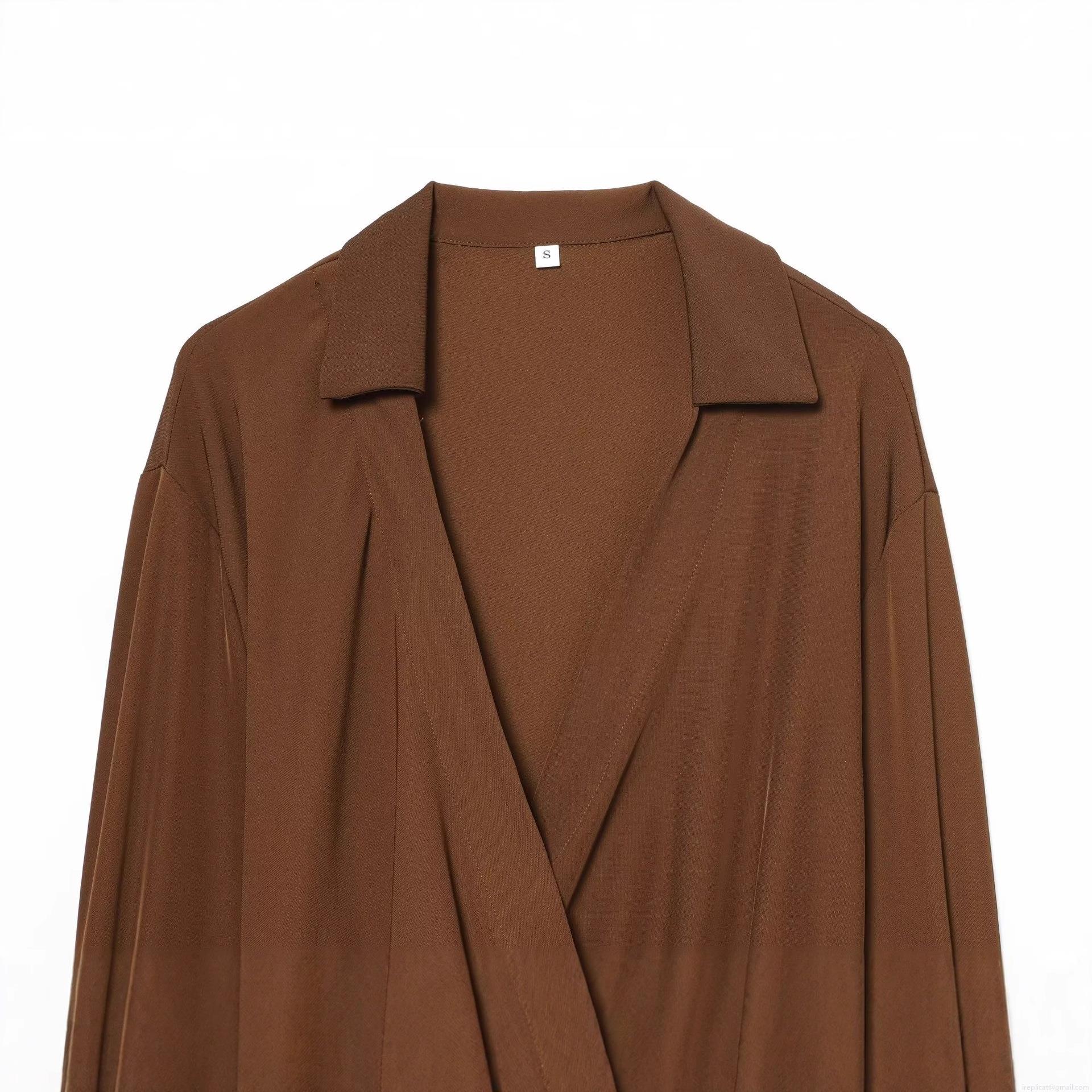 • Women's Caramel Long Sleeve Wrap Blouse Elegant V-Neck Tie Waist Pleated Polyester Shirt Fashion Casual Tops For Women Soft Woven Fabric Blouse
