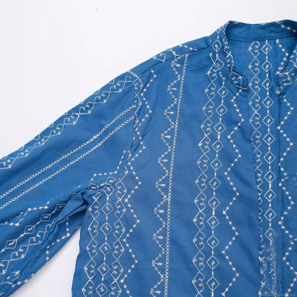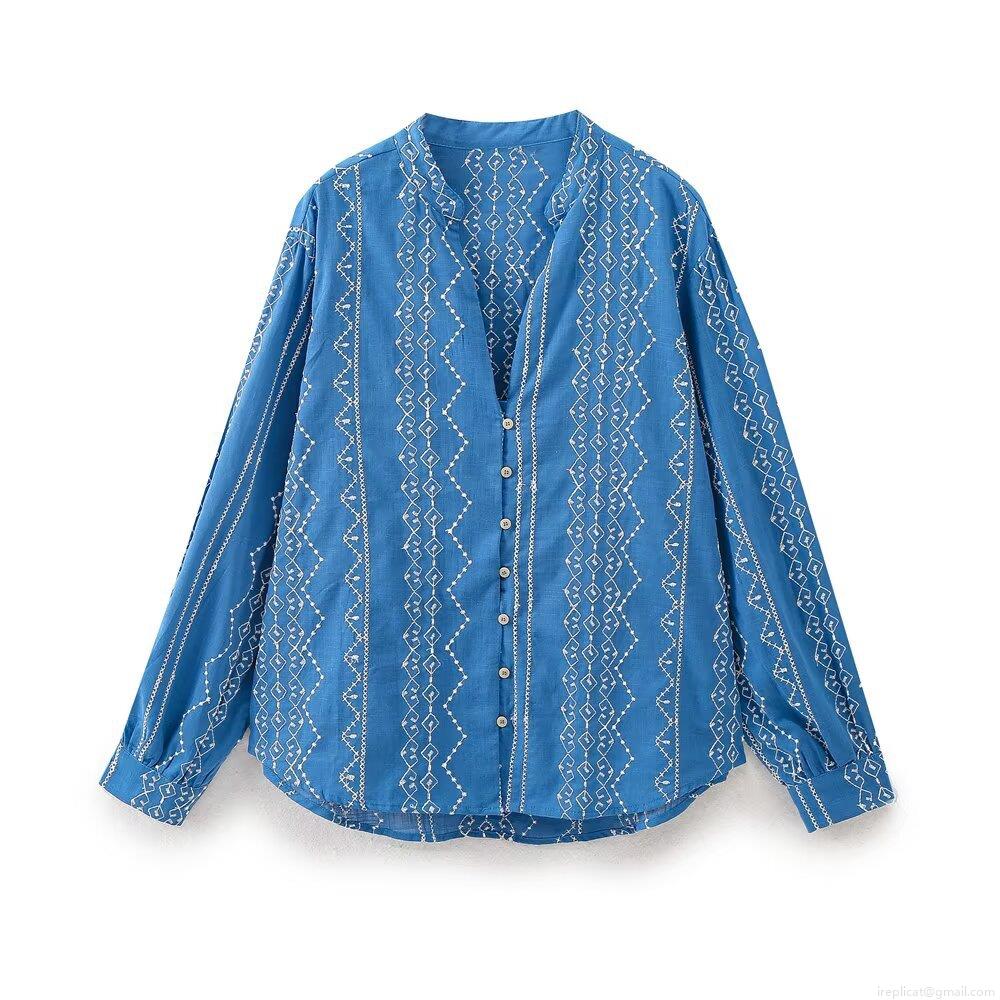 Women's Casual Blue Cotton Blend Embroidered Shirt Loose Fit Long Sleeve V-Neck Button Down Blouse With Geometric Pattern For Summer Streetwear