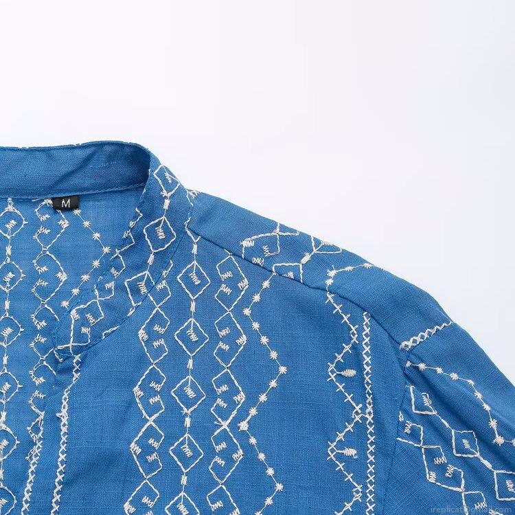 • Women's Casual Blue Cotton Blend Embroidered Shirt Loose Fit Long Sleeve V-Neck Button Down Blouse With Geometric Pattern For Summer Streetwear