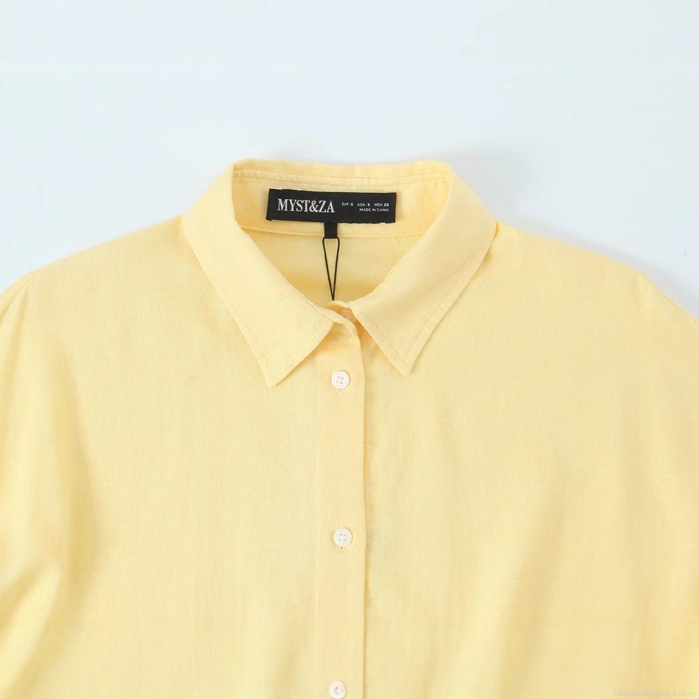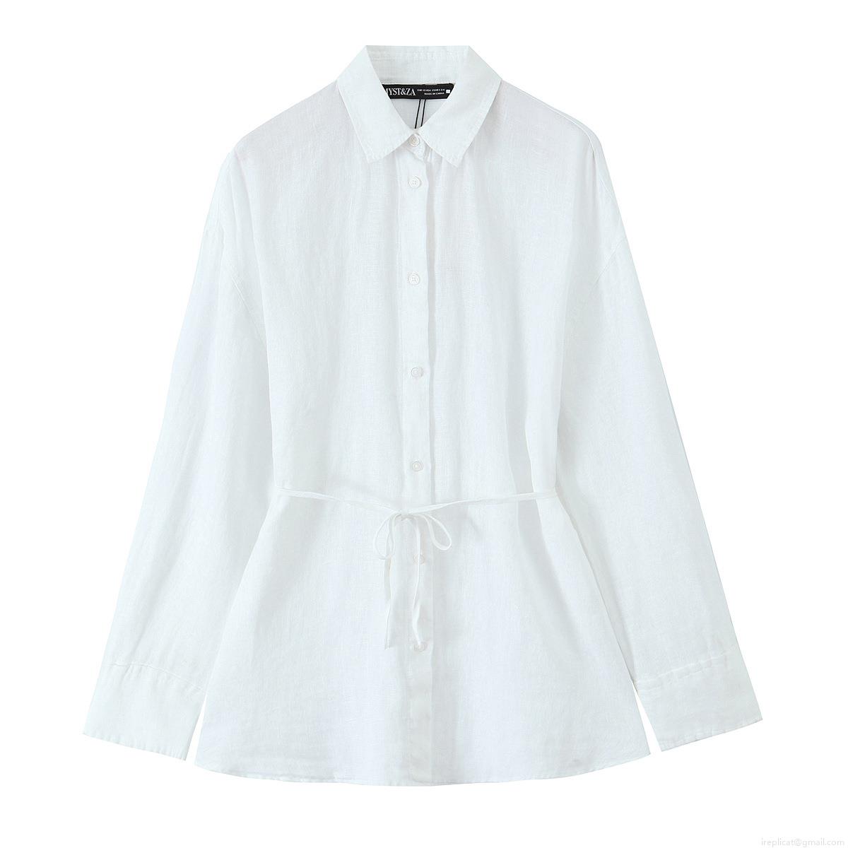 • Women's Casual Cotton Linen Blend Long Sleeve Shirt Turn-down Collar Waist Drawstring Solid Color Blouse Top For Ladies