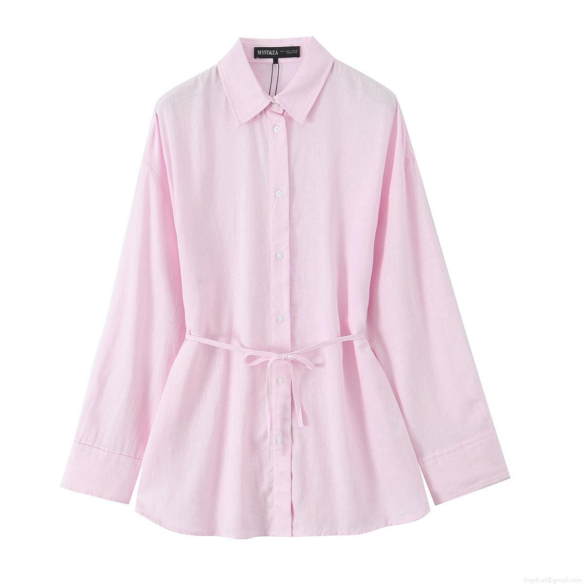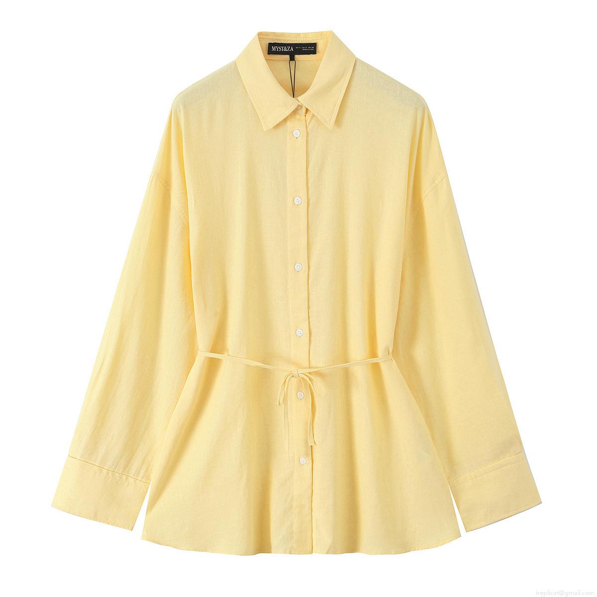 Women's Casual Cotton Linen Blend Long Sleeve Shirt Turn-down Collar Waist Drawstring Solid Color Blouse Top For Ladies