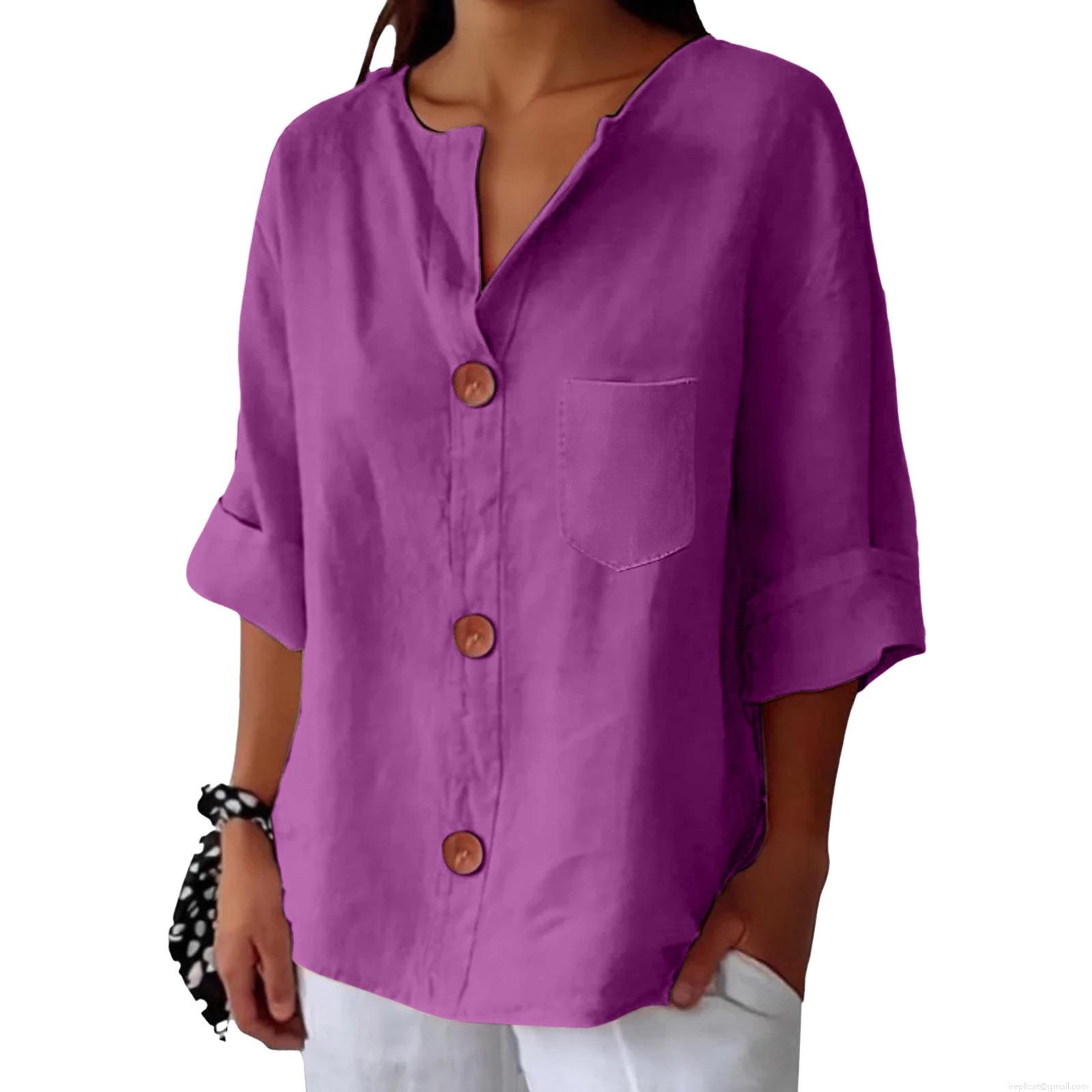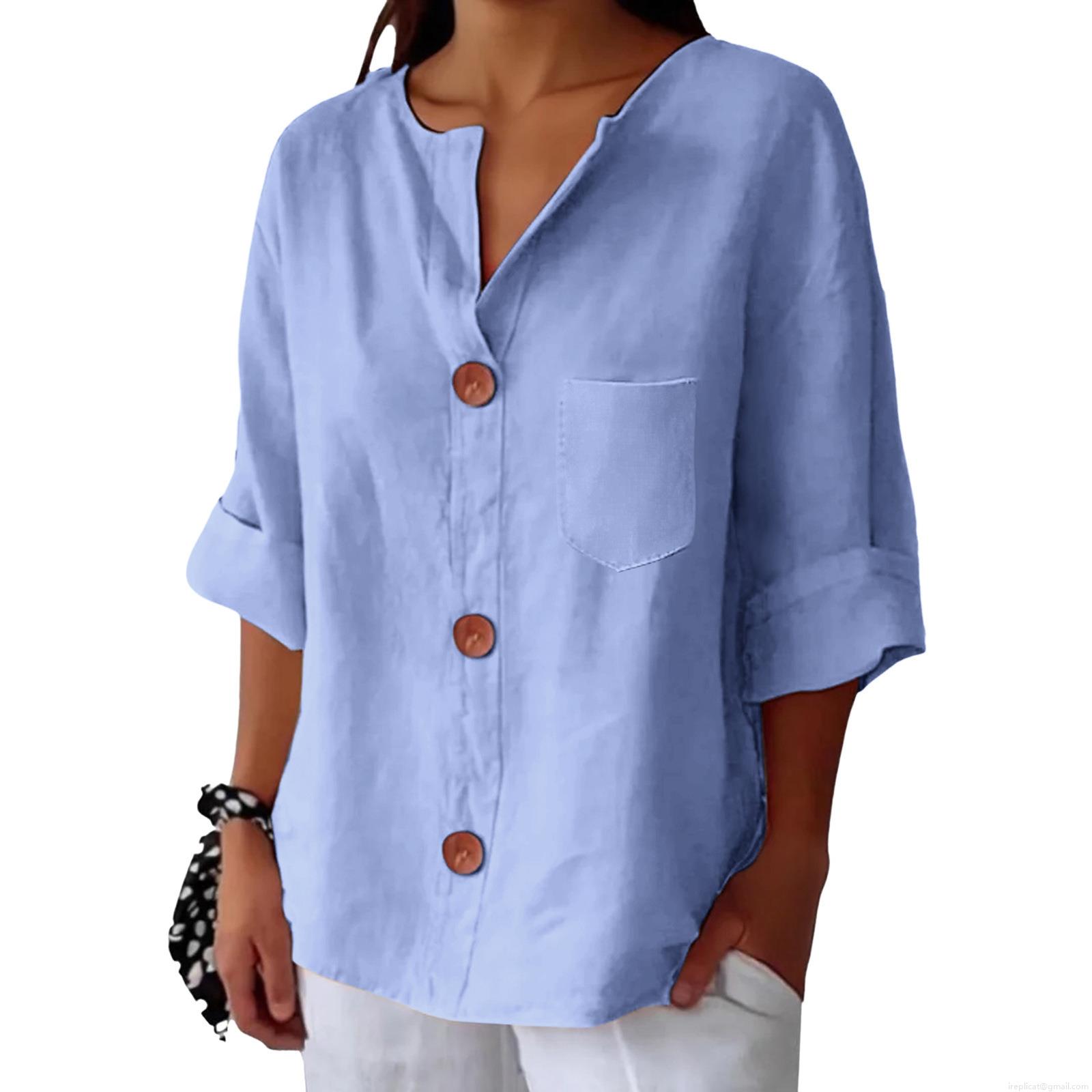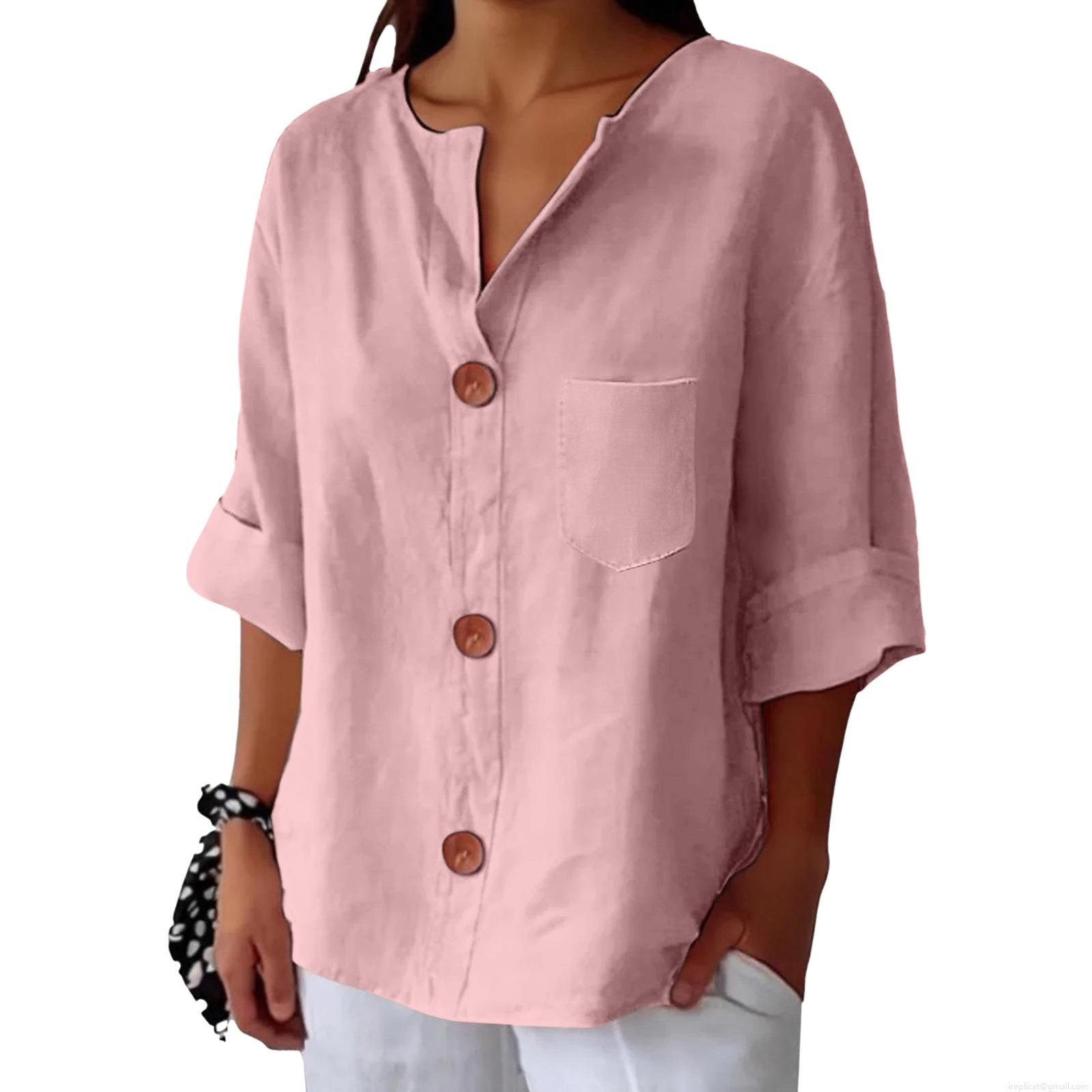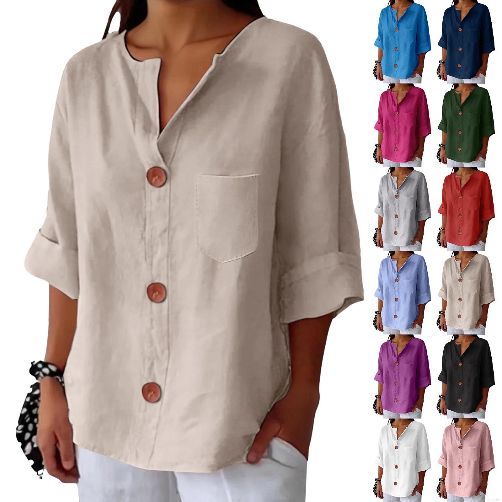 • Women's Casual Cotton Linen Blouse V Neck Button Up Loose T-Shirt With Pocket Short Sleeve Summer Tops Solid Color Comfy Tunic