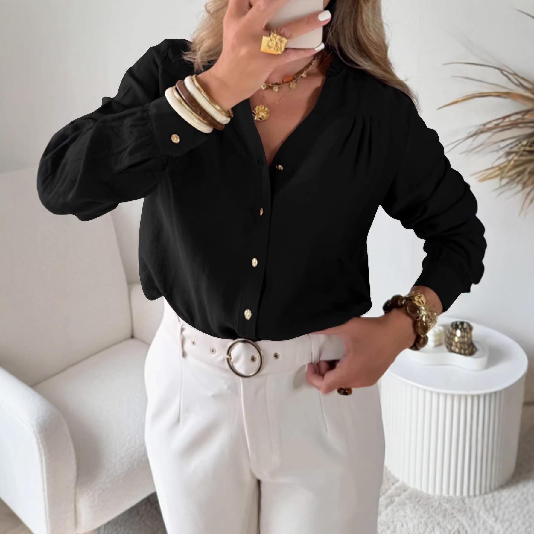 • Women's Casual Elegant V-Neck Ruffle Trim Long Sleeve Blouse Woven Polyester Spandex Solid Color Button Down Shirt For Office Daily Wear Fashion Top
