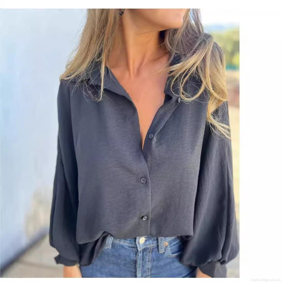Solid Color, Buttons, Lantern Sleeves, Wrinkled Texture