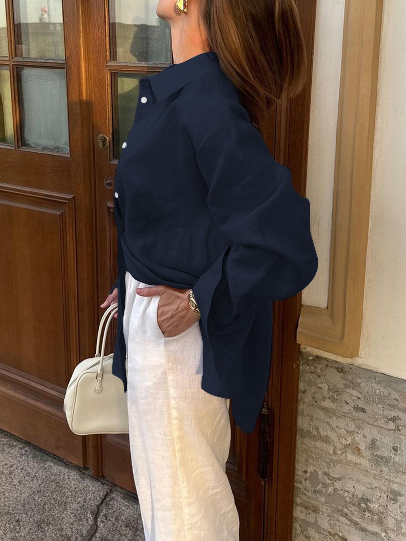 • Women's Casual Loose 100% Cotton Shirt Long Sleeve Button Down Lapel Solid Color Blouse Top For Vacation Holiday Daily Wear European Fashion
