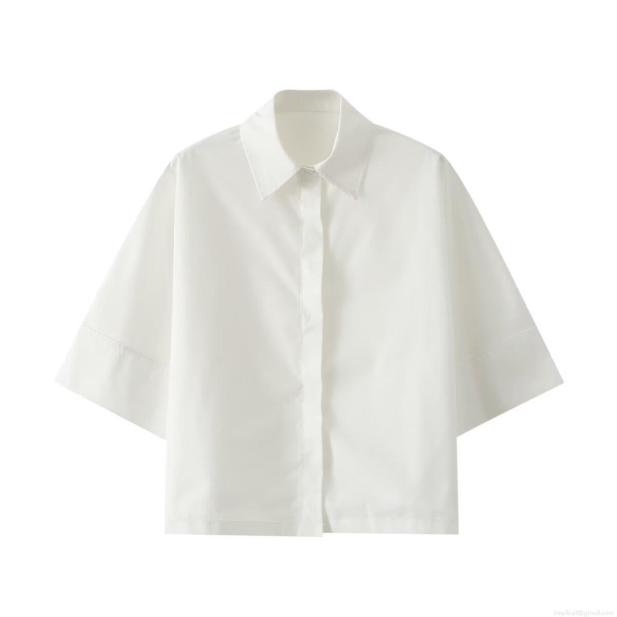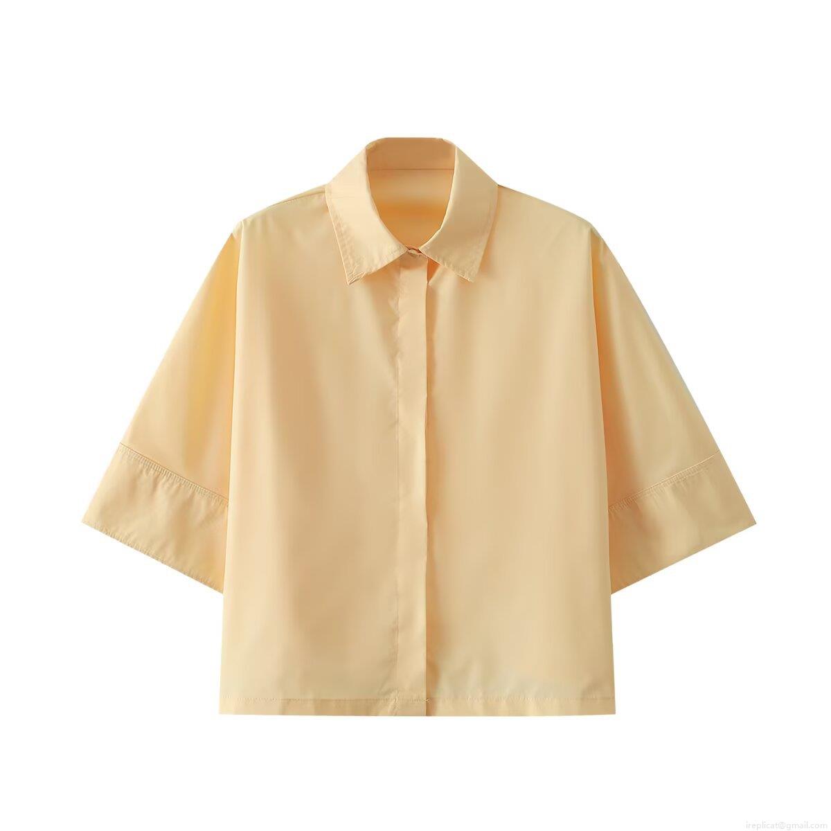 • Women's Casual Loose Short Sleeve Lapel Shirt Solid Color Single Breasted Cropped Blouse With Pocket Summer Autumn Fashion Top