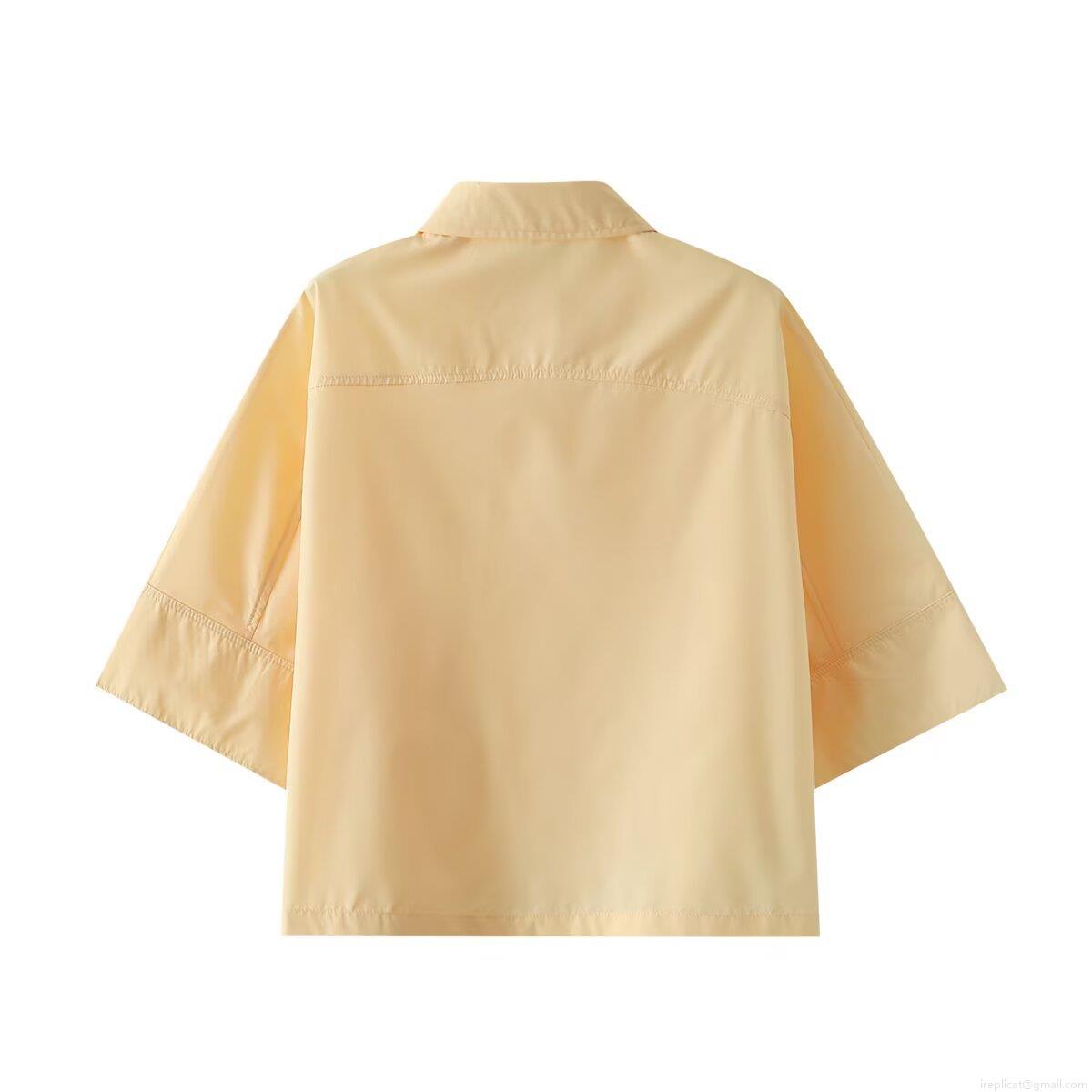 Women's Casual Loose Short Sleeve Lapel Shirt Solid Color Single Breasted Cropped Blouse With Pocket Summer Autumn Fashion Top