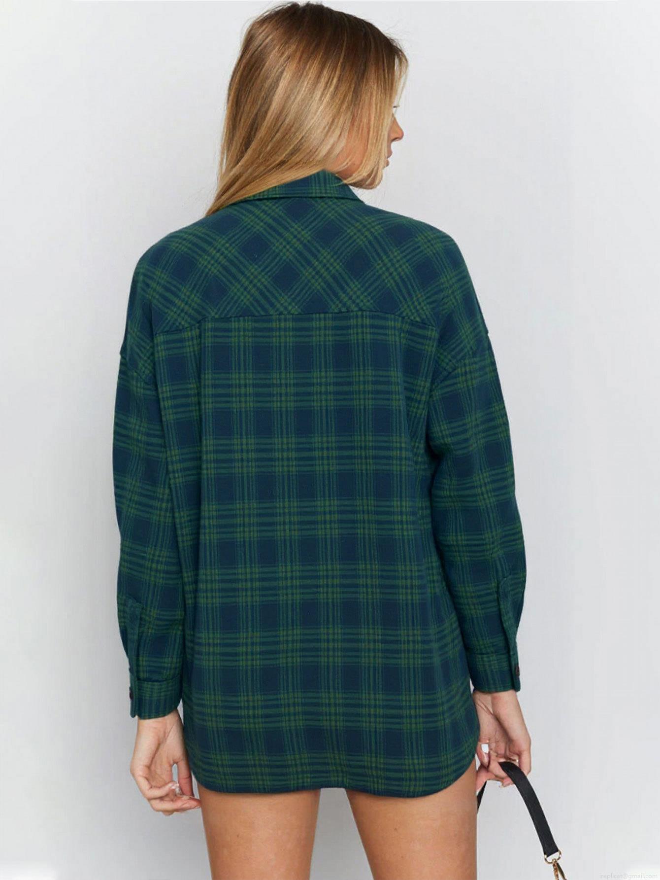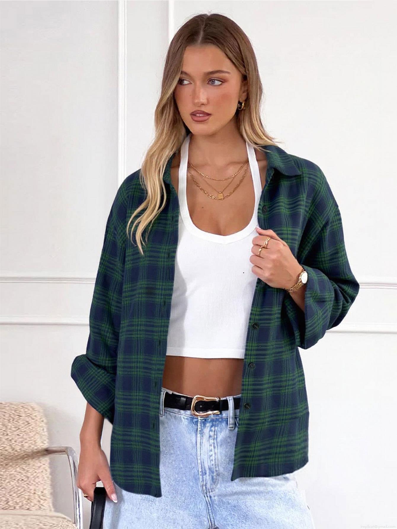 • Women's Casual Plaid Long Sleeve Shirt Oversized Color Block Button Down Blouse Acetate Polyester Flannel Style Loose Top For Autumn Daily Wear