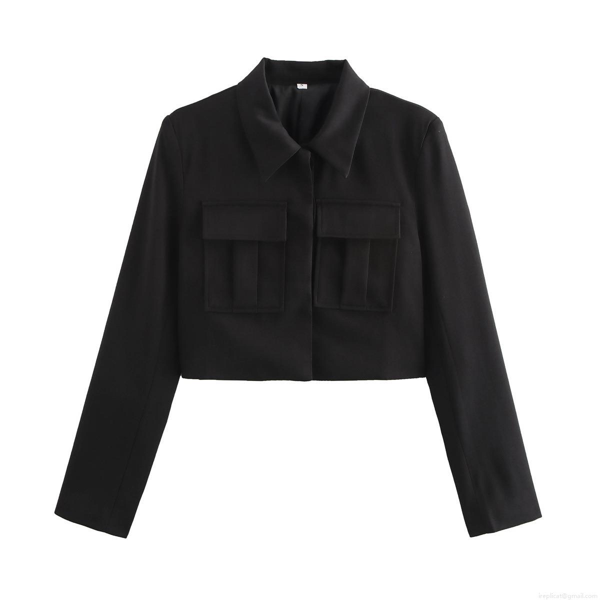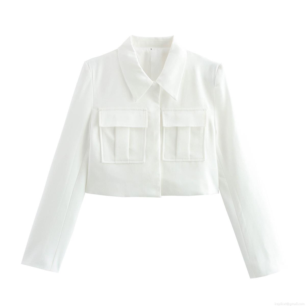 • Women's Casual Polyester Long Sleeve Button Down Shirt Short Workwear Style Jacket Blouse With Double Pockets Streetwear Top For Women