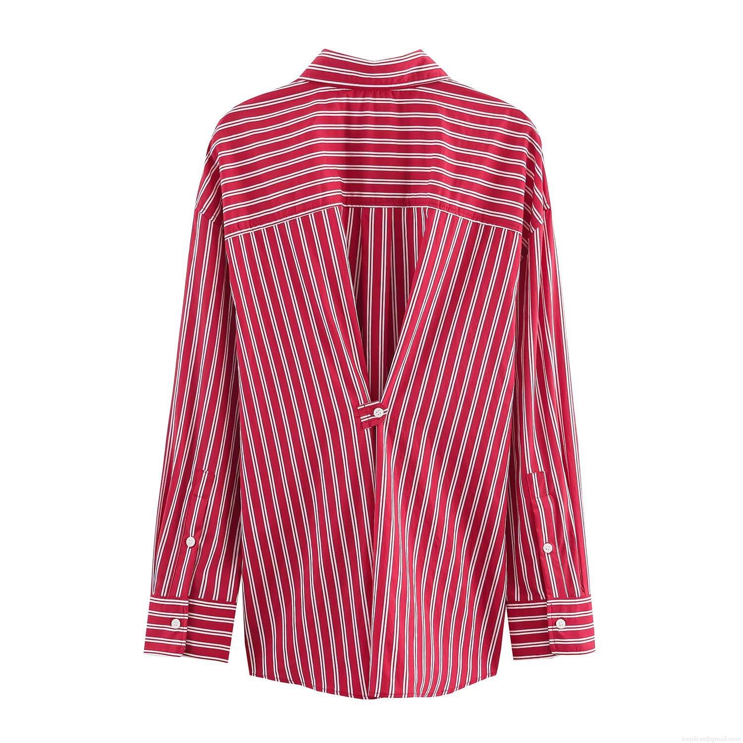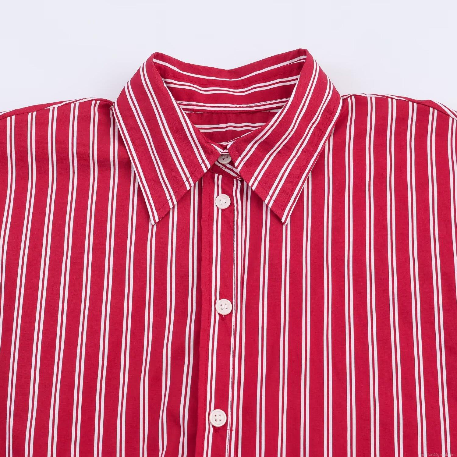 • Women's Casual Red And White Vertical Striped Poplin Shirt Loose Button Up Long Sleeve Lapel Blouse For Daily Office Wear Lady Fashion Tops