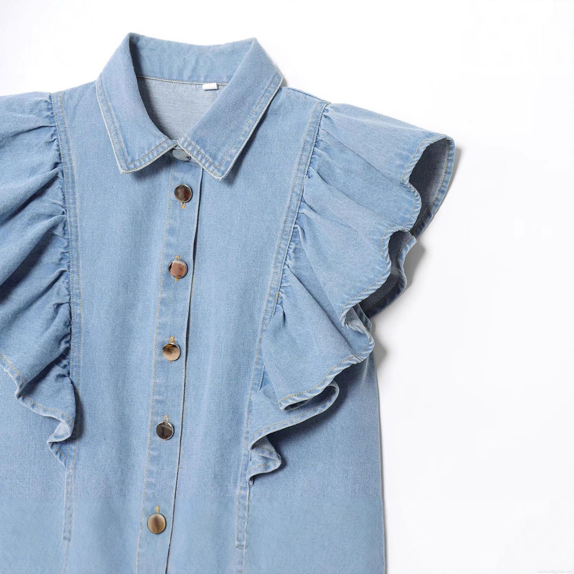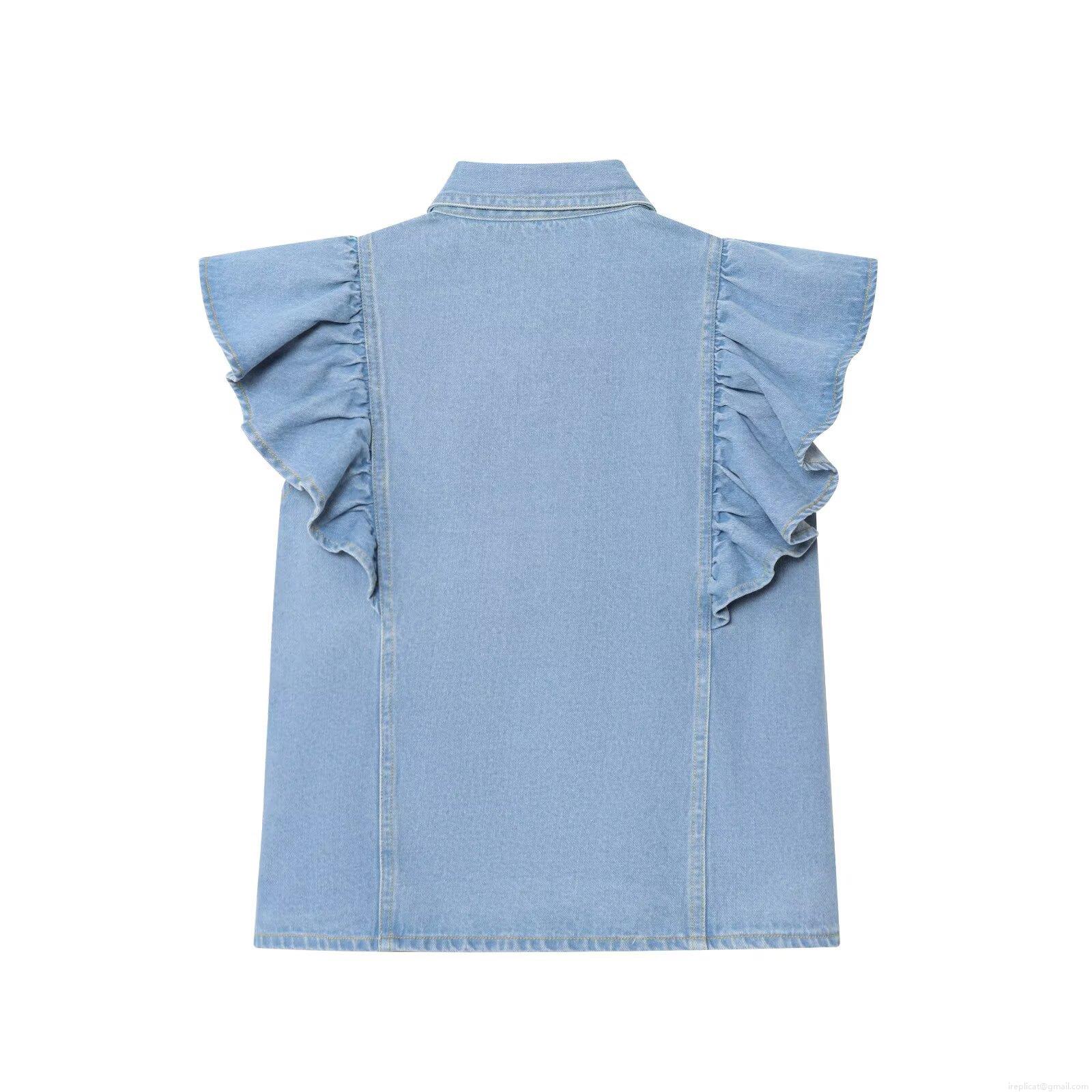• Women's Casual Sleeveless Denim Blouse Lapel Collar Single Breasted Shirt With Ruffle Flying Sleeves Washed Denim Top For Women Streetwear