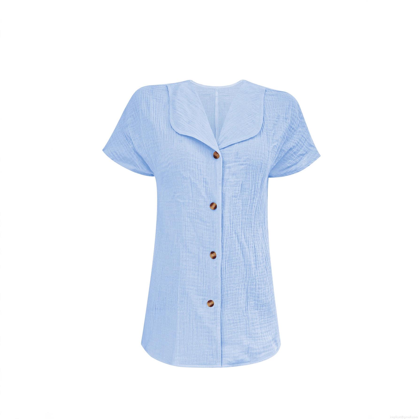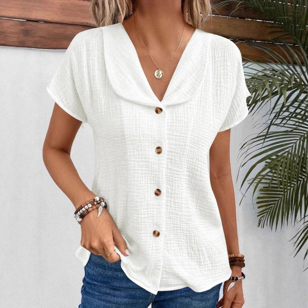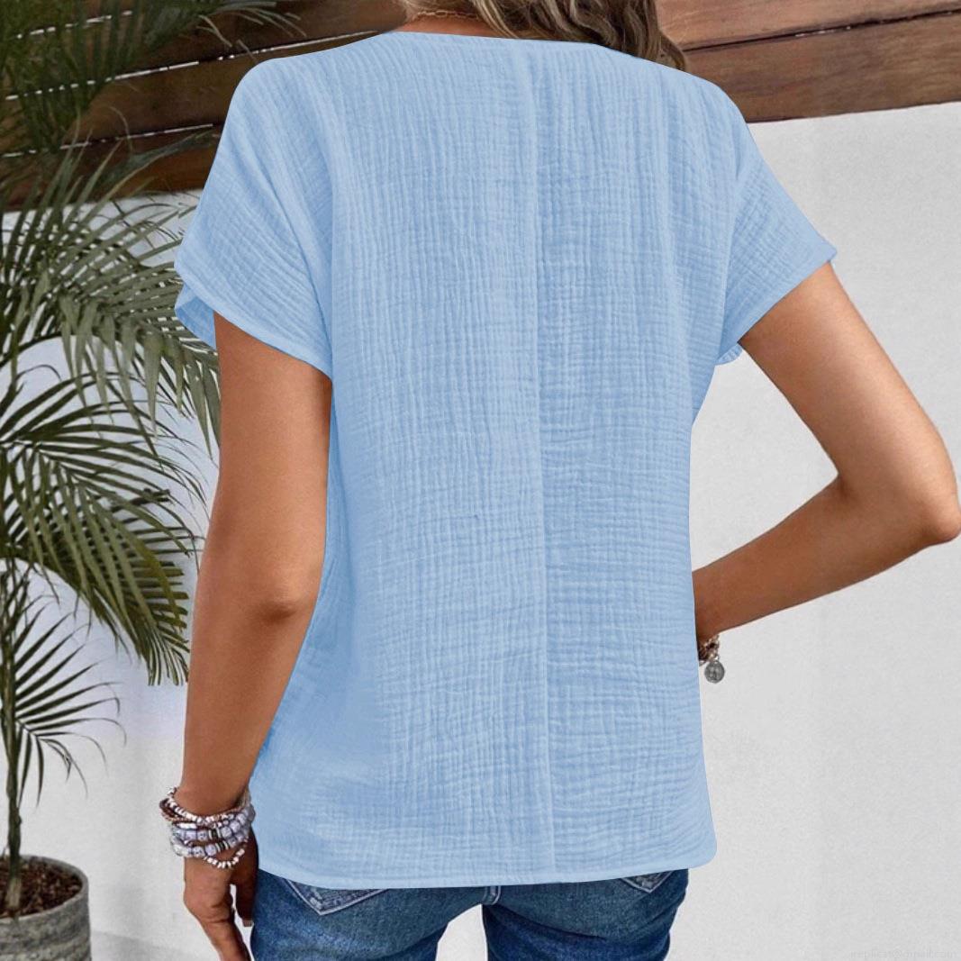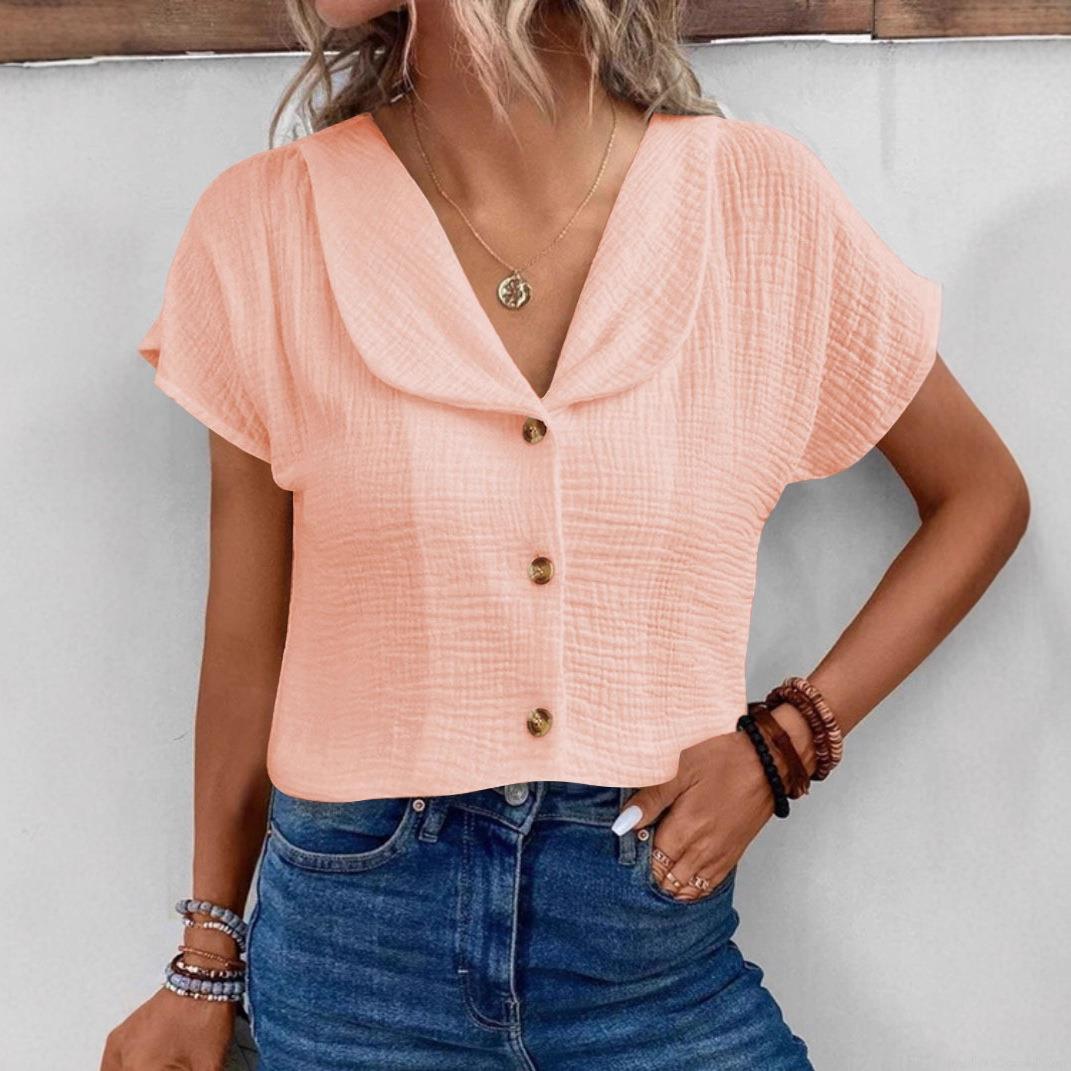 • Women's Casual Textured Short Sleeve Shirt V Neck Peter Pan Collar Single Breasted Blouse Cotton Blend Summer Loose Top Solid Color Clothing