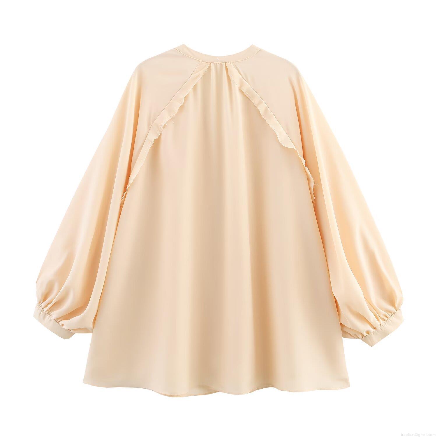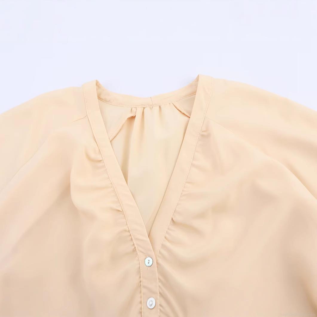 • Women's Casual V Neck Lantern Sleeve Blouse Satin Texture Polyester Single Breasted Solid Color Loose Fit Shirt Summer Autumn Long Sleeve Top