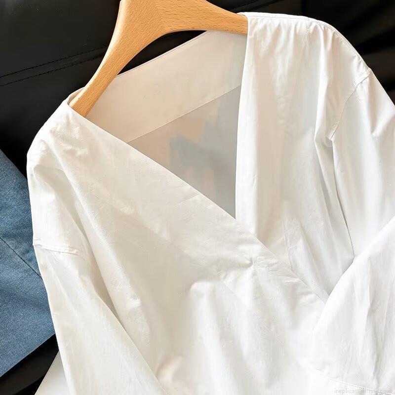 • Women's Casual V-Neck Long Sleeve Shirt 95% Cotton 5% Spandex Loose Fit Minimalist Blouse For Daily Office Wear Soft Breathable White Top