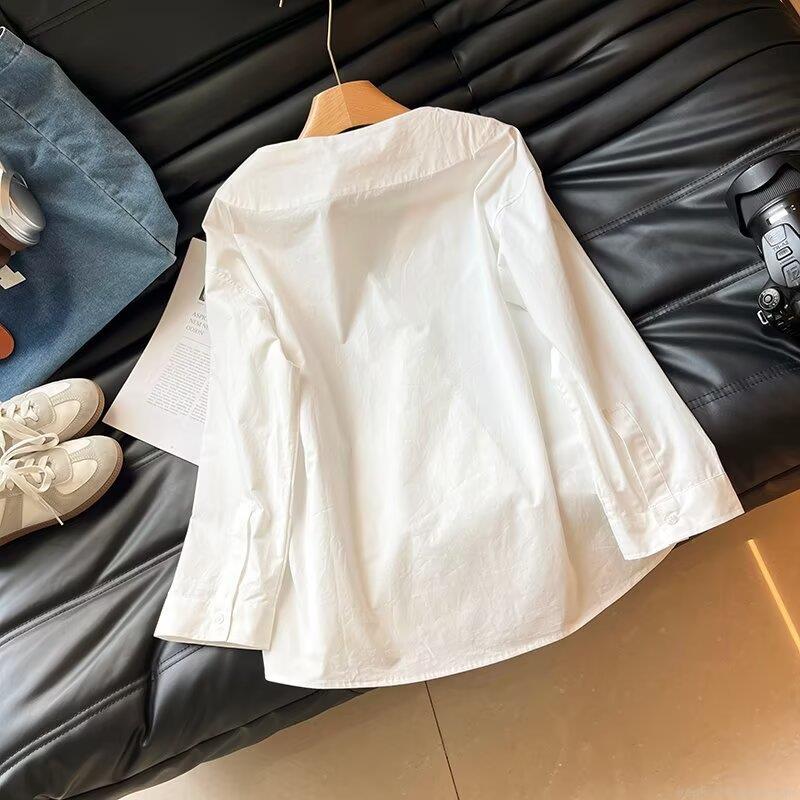 Women's Casual V-Neck Long Sleeve Shirt 95% Cotton 5% Spandex Loose Fit Minimalist Blouse For Daily Office Wear Soft Breathable White Top