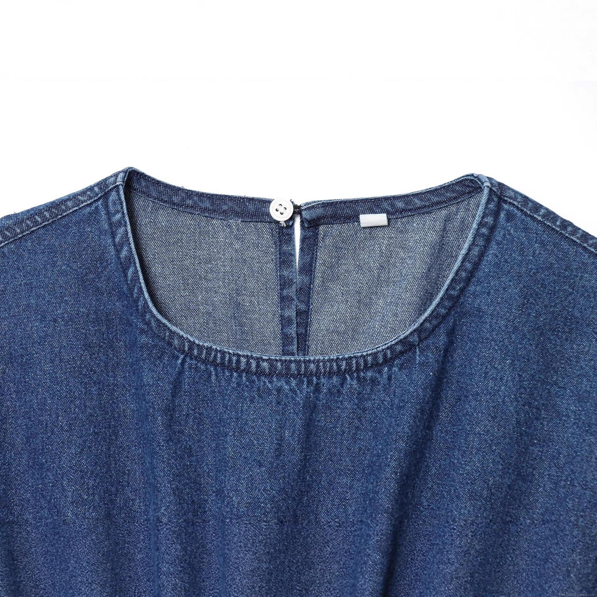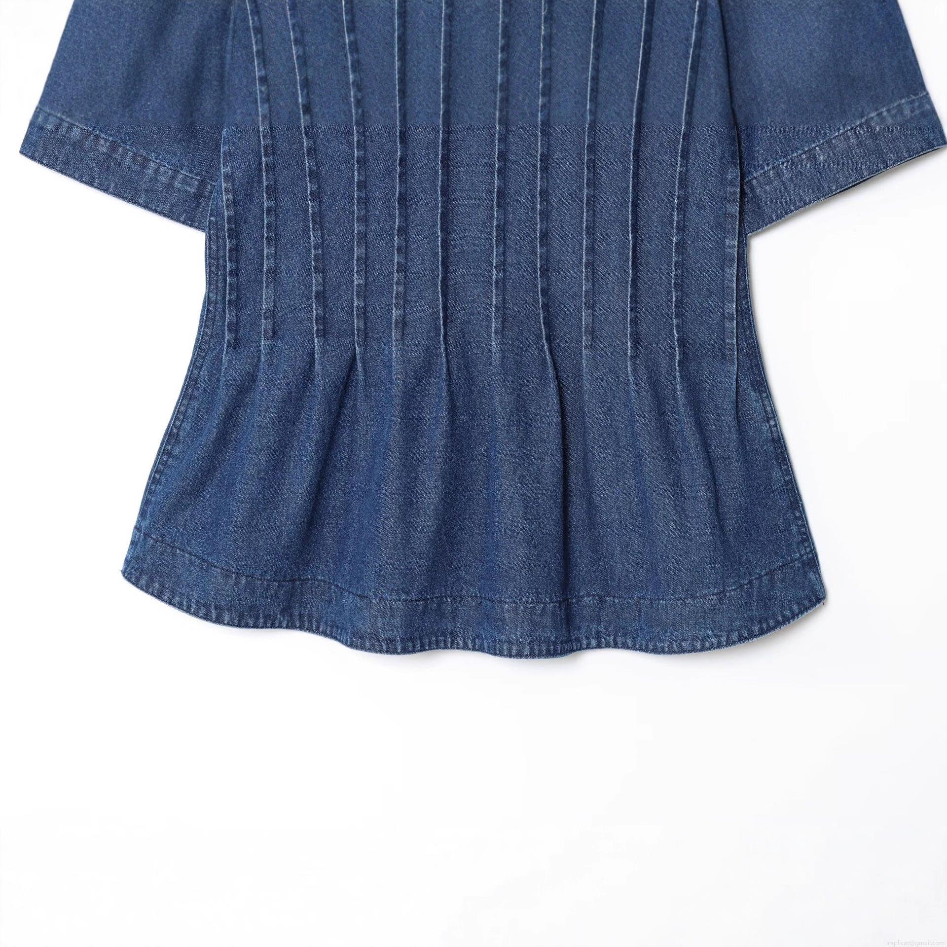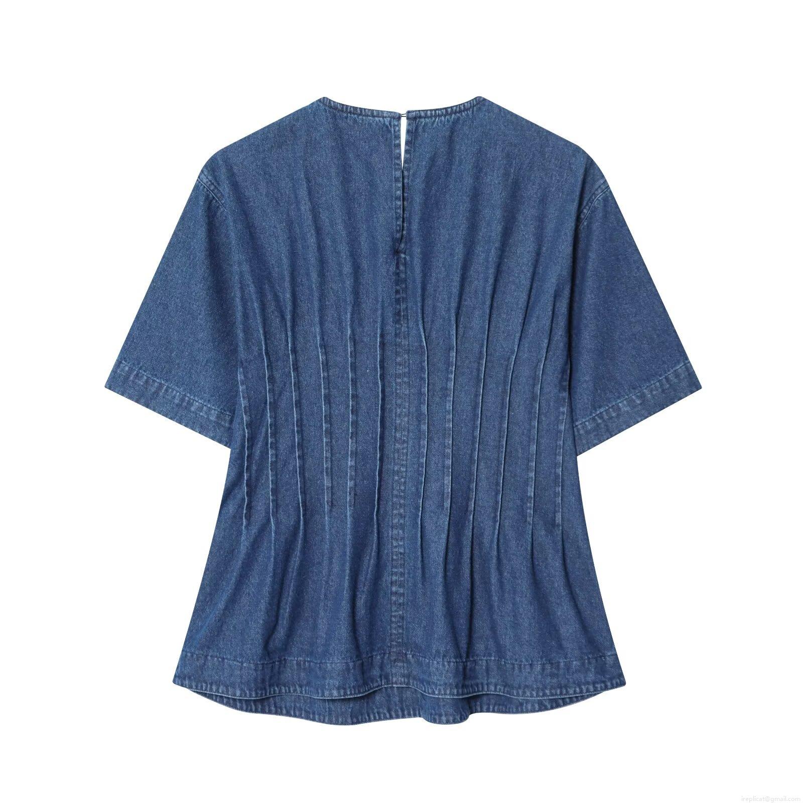 • Women's Casual Western Style Denim Blouse Short Sleeve Round Neck Vertical Pleated Waist Cinching Polyester Denim Shirt Back Zipper Top For Daily Wear Streetwear