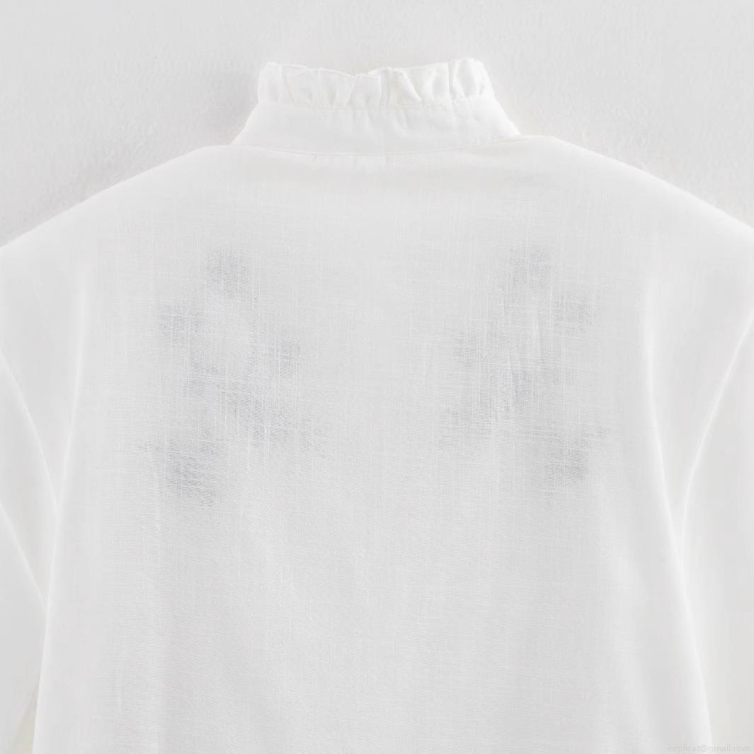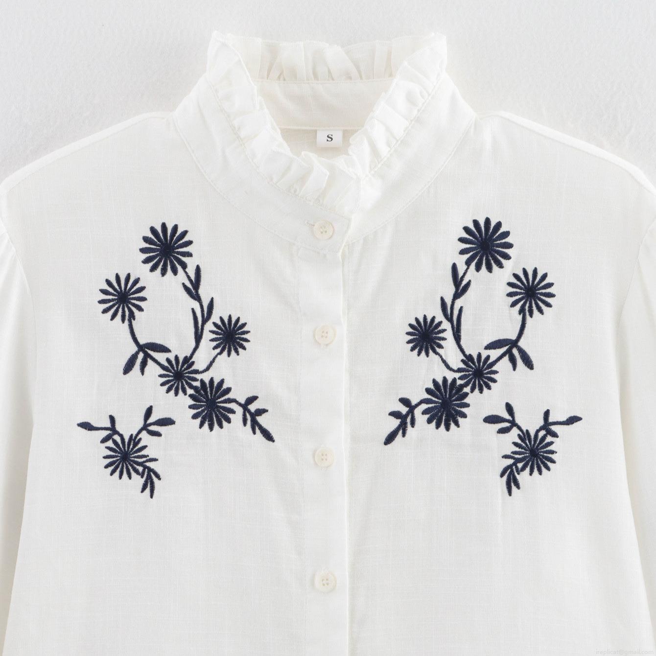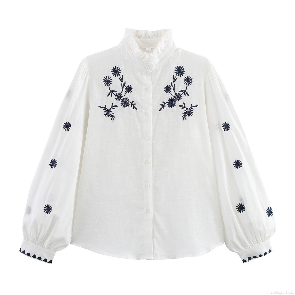 • Women's Casual White Long Sleeve Embroidery Blouse Ruffle Stand Collar Button Up Loose Fit Polyester Shirt For Lady Daily Vacation Top