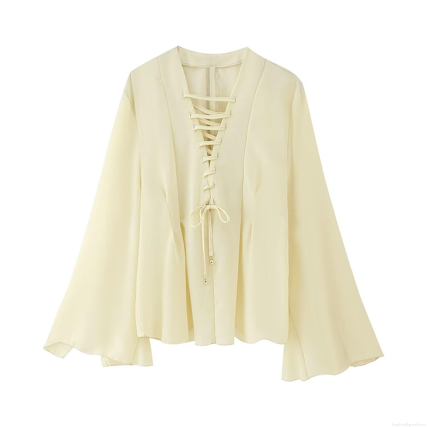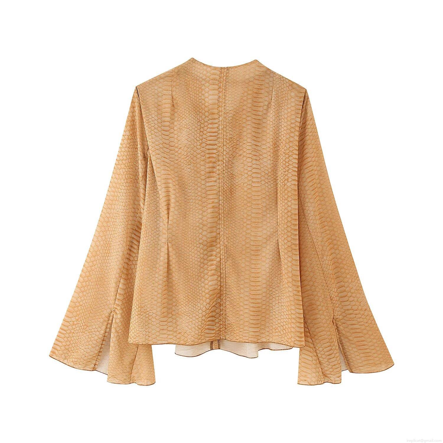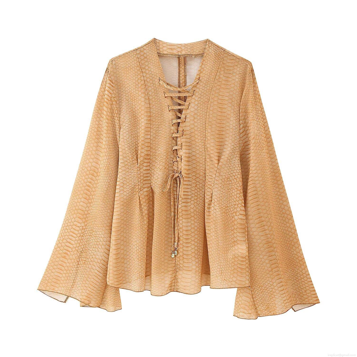 • Women's Chiffon Blouse V Neck Lace Up Front Flare Long Sleeve Snake Print Solid Color European Style Casual Tops For Women Streetwear Fashion Spring Summer