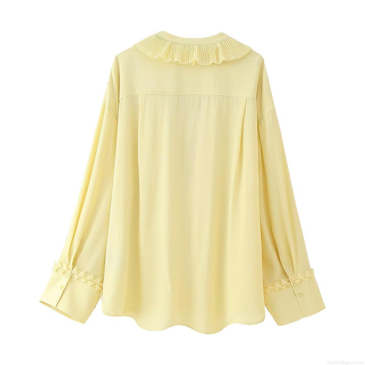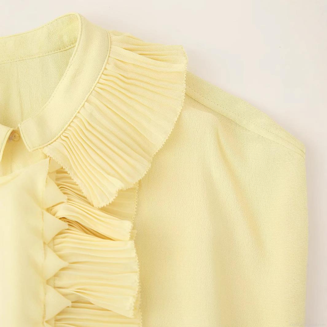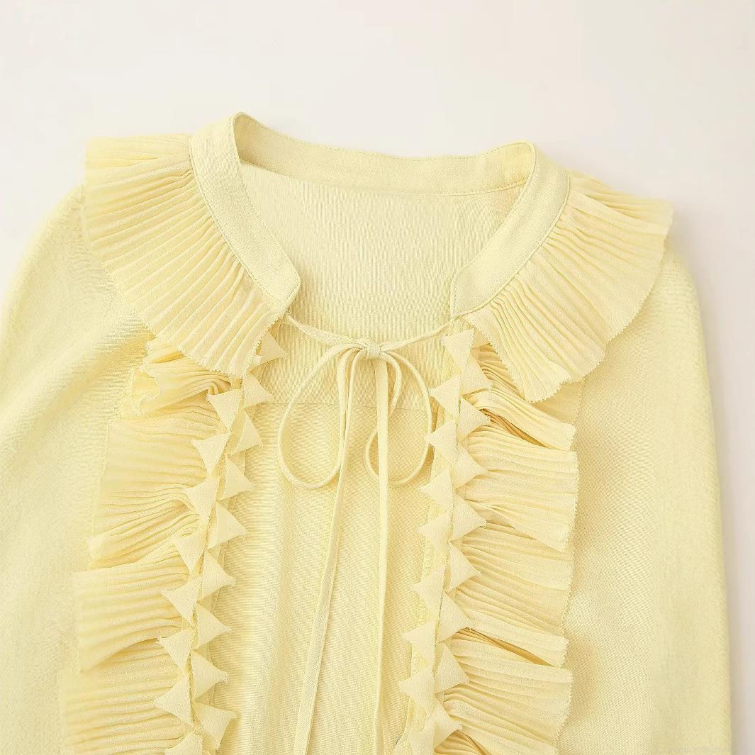 Women's Chiffon Blouse V-Neck Ruffle Pleated Long Sleeve Lace-up Shirt Loose Fit French Vintage Elegant Pale Yellow Casual Top For Lady