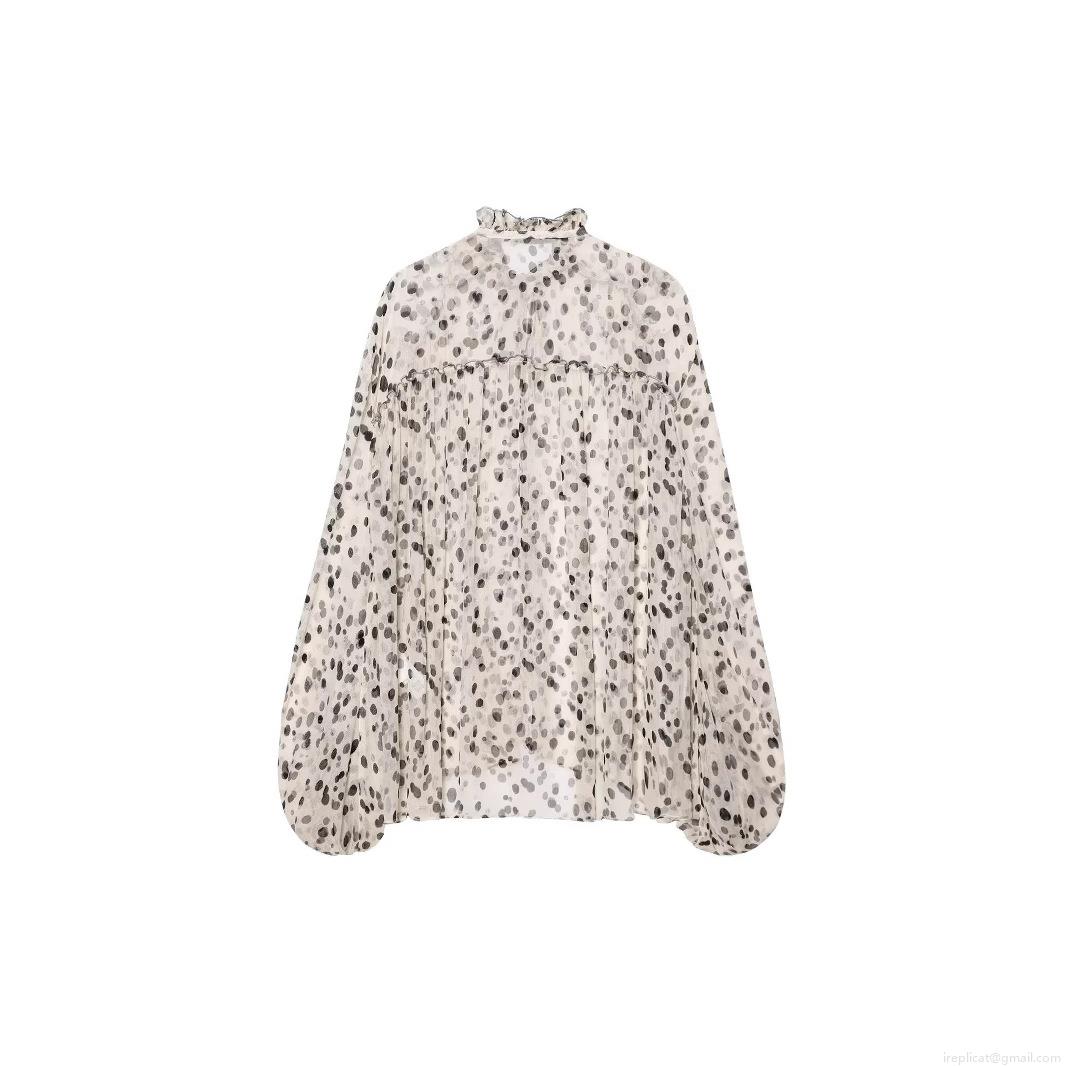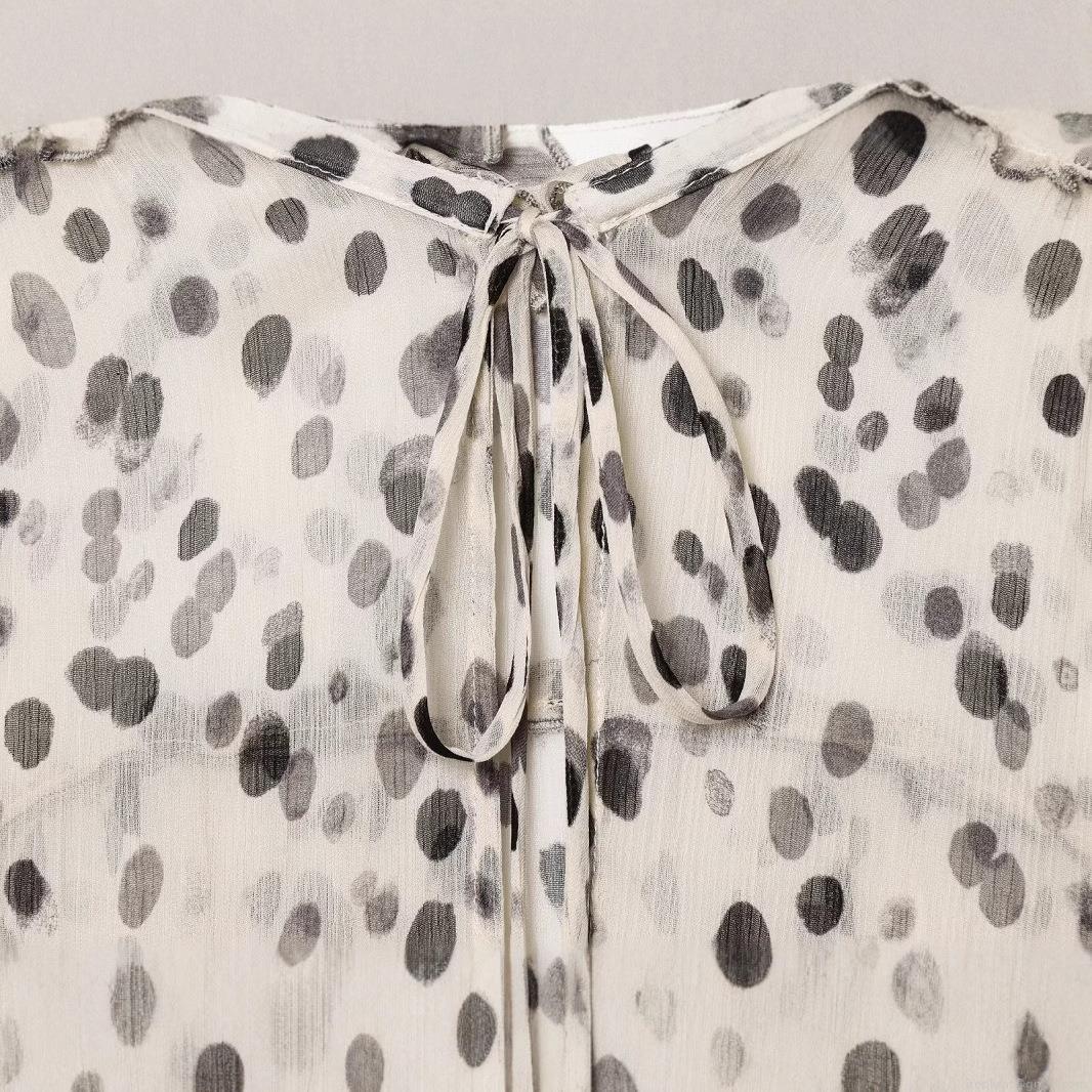 • Women's Chiffon Polka Dot Blouse Ruffle Stand Collar Tie Neck Long Lantern Sleeve Shirt Loose Longline Casual Streetwear Top