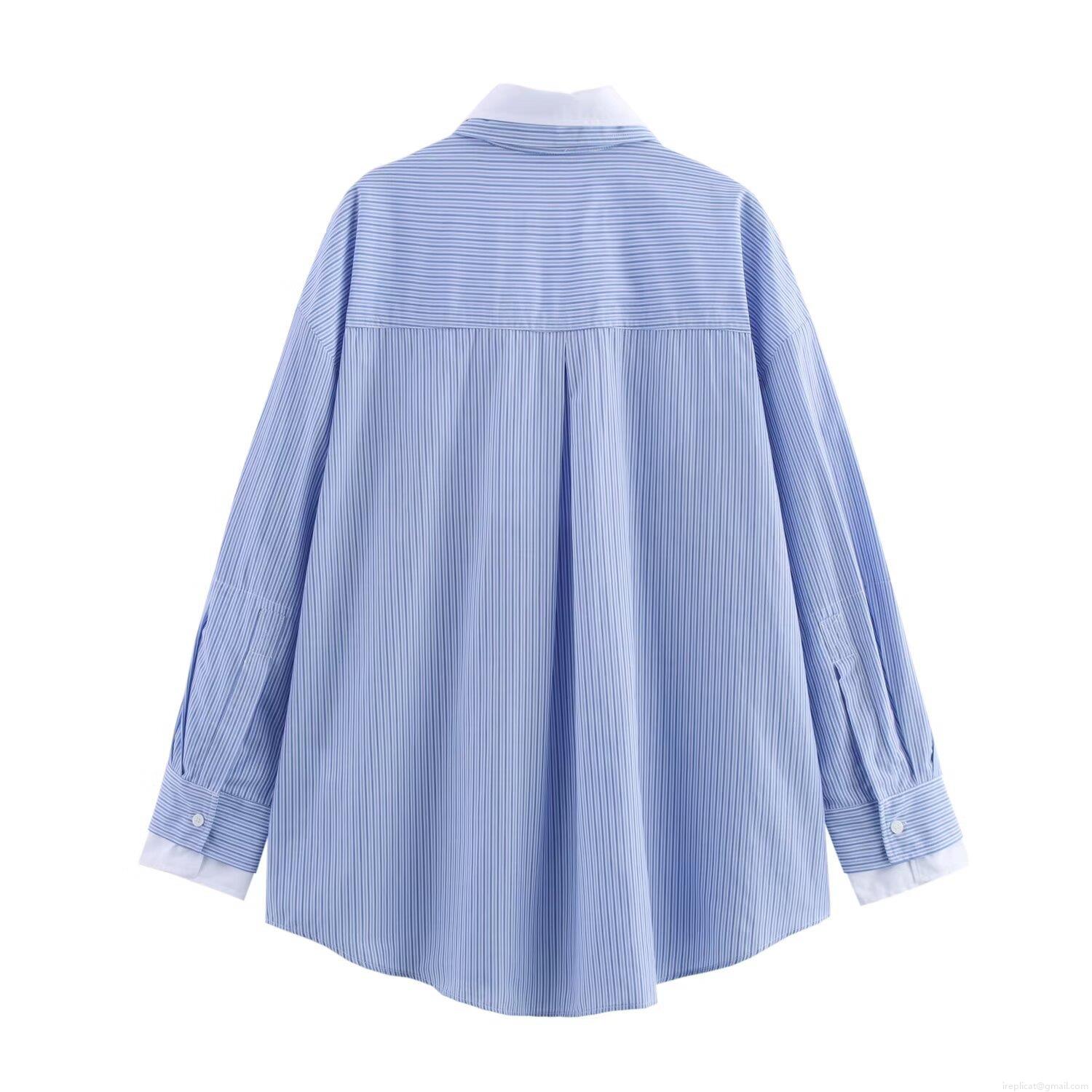 Women's Contrast Color Poplin Patchwork Striped Shirt Loose Fit Long Sleeve Button Down Blouse Casual Commute Lapel Top For Ladies