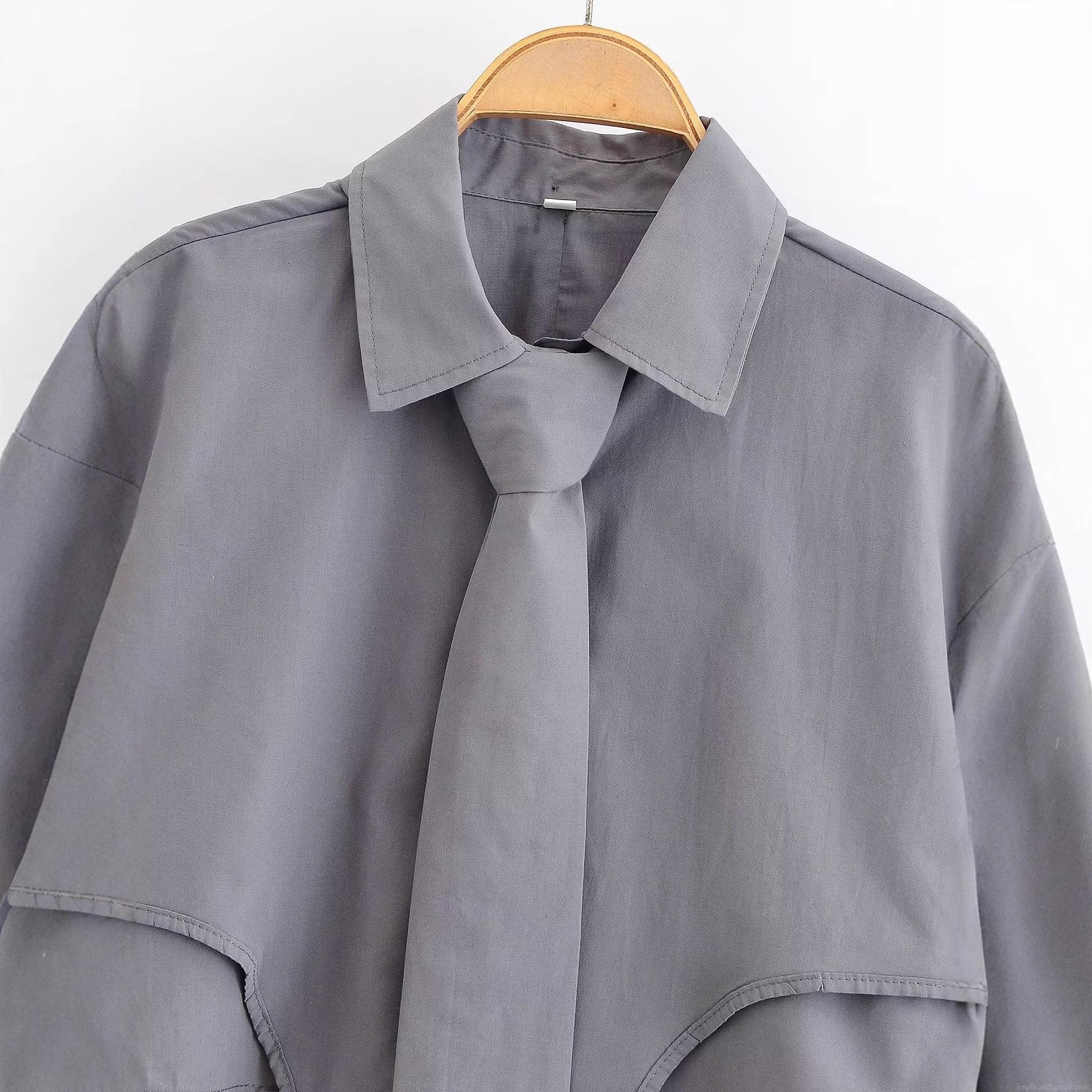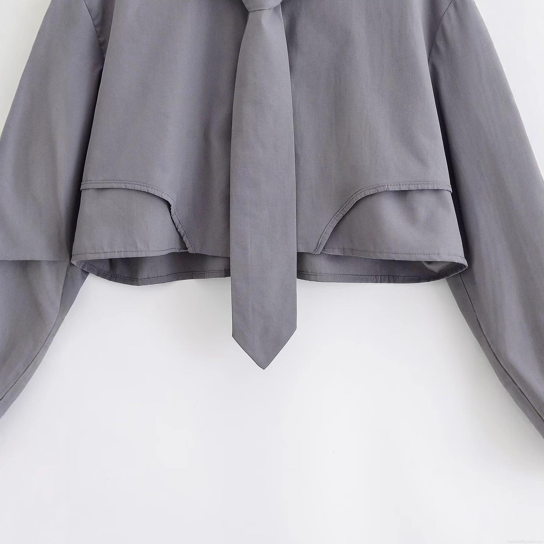 • Women's Cropped Long Sleeve Polyester Shirt With Matching Tie Solid Deep Space Grey Blouse Modern Preppy Style Top For Office Daily School
