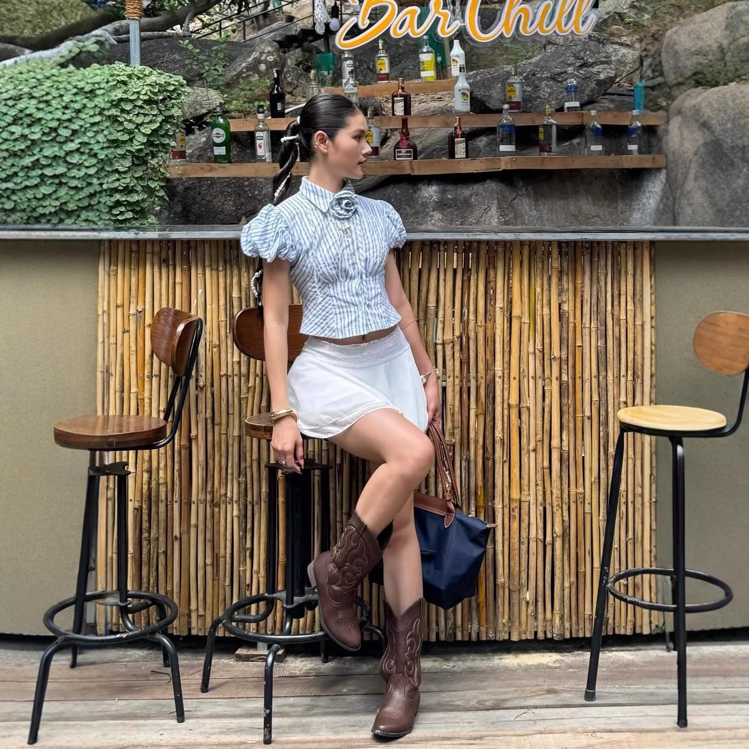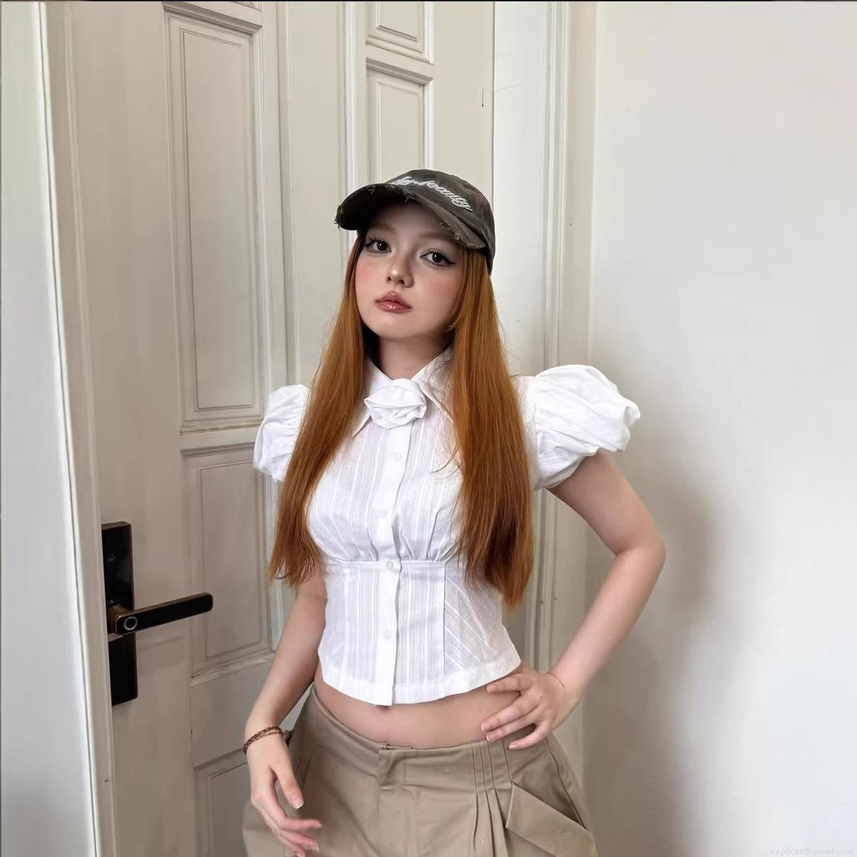 • Women's Cropped Short Sleeve Bubble Sleeve Blouse Sweet French Style Waist-Cinching Striped Polyester Shirt For Daily Casual Wear