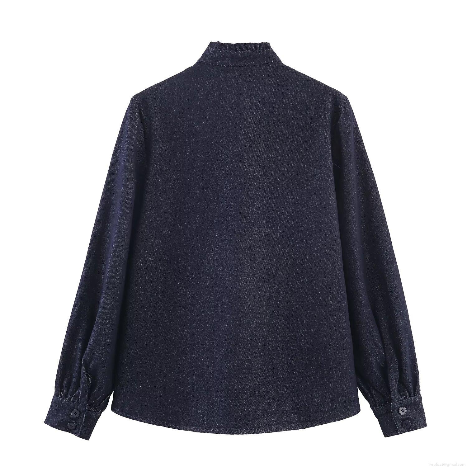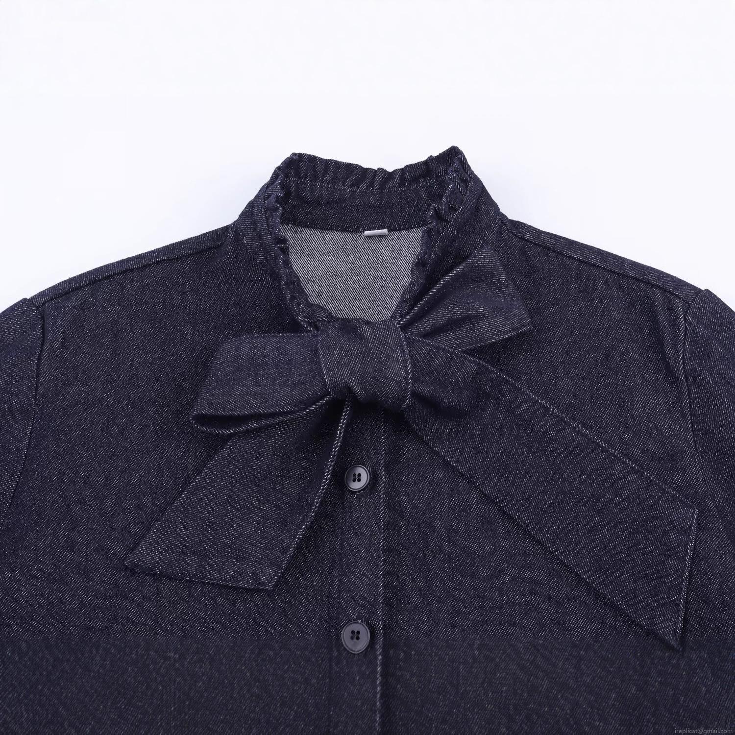 • Women's Dark Blue Denim Shirt Elegant Bow-Tie Neck Long Sleeve Single Breasted Blouse Sweet Socialite Style Casual Fashion Top For Lady Spring Autumn