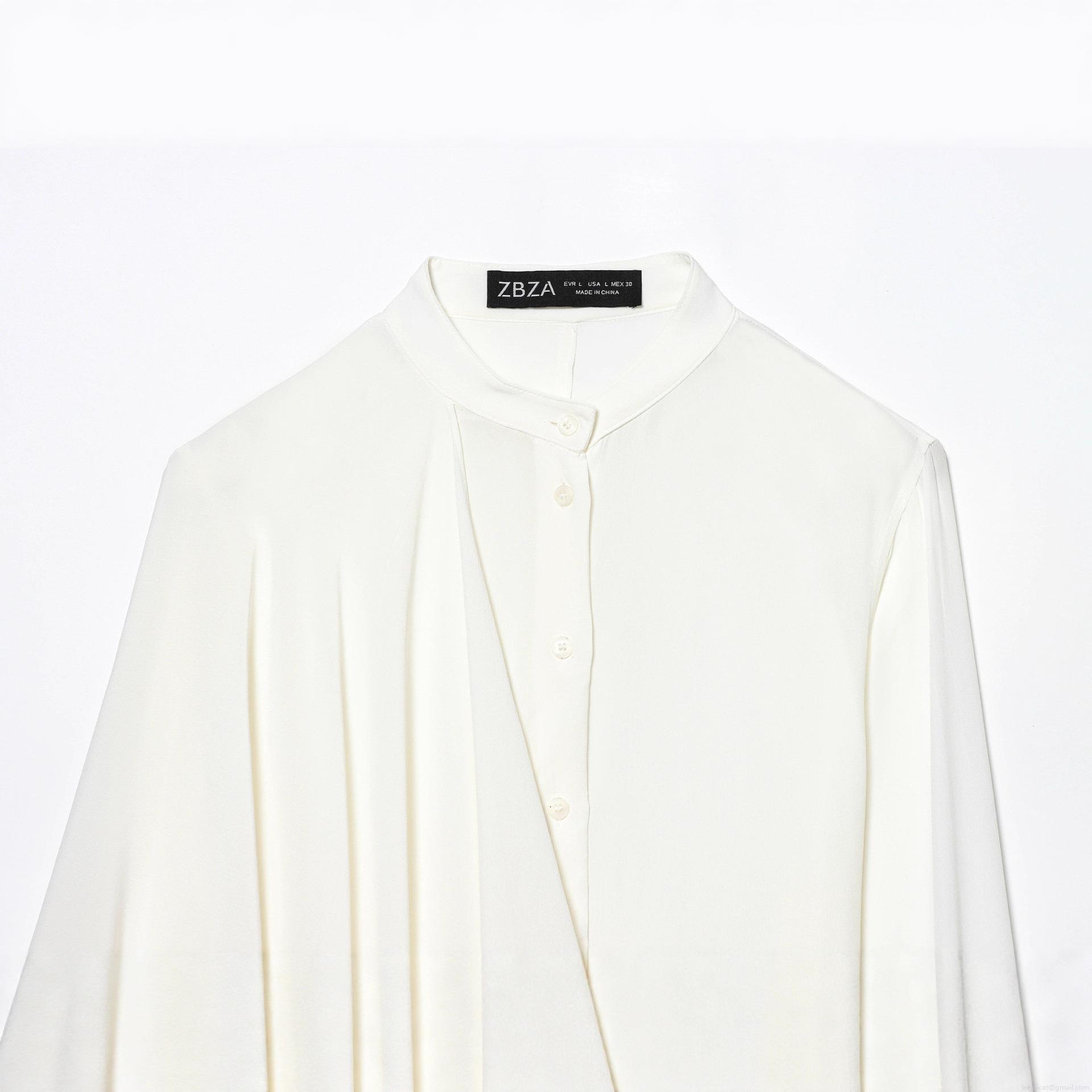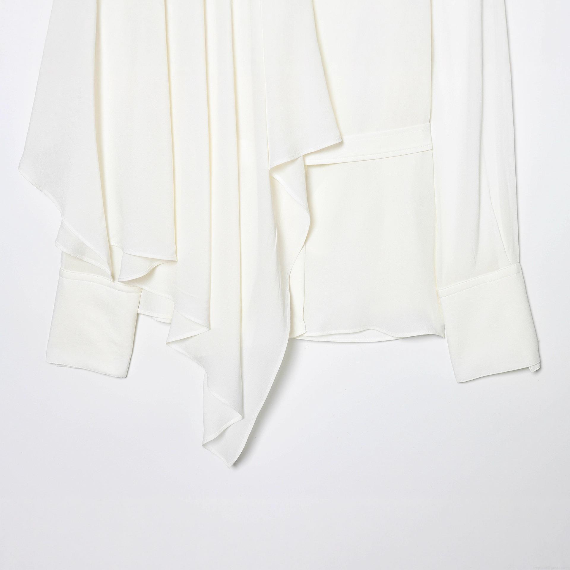 • Women's Elegant Asymmetric White Blouse Long Sleeve Round Neck Silky Polyester Shirt With Back Tie Bow Irregular Design Casual Streetwear Top