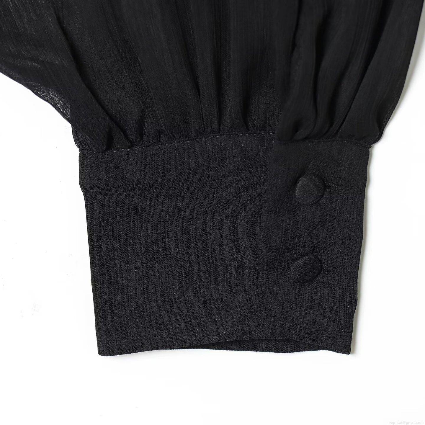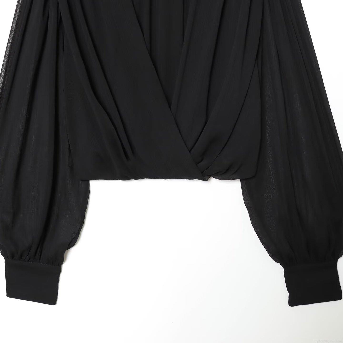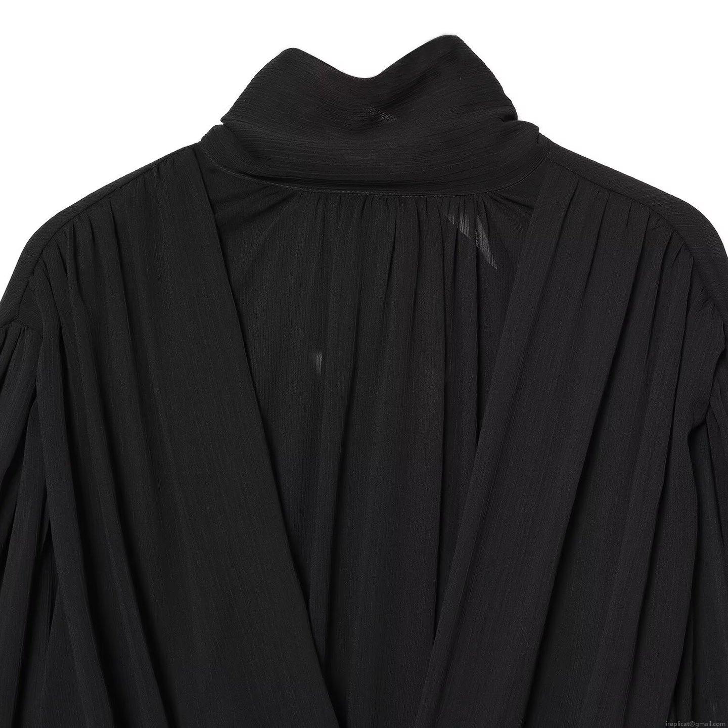 • Women's Elegant Black Pleated Chiffon Blouse Long Sleeve Lantern Sleeve Bow Tie Back Stand Collar V Neck Casual Fashion Top For Party Office Lady
