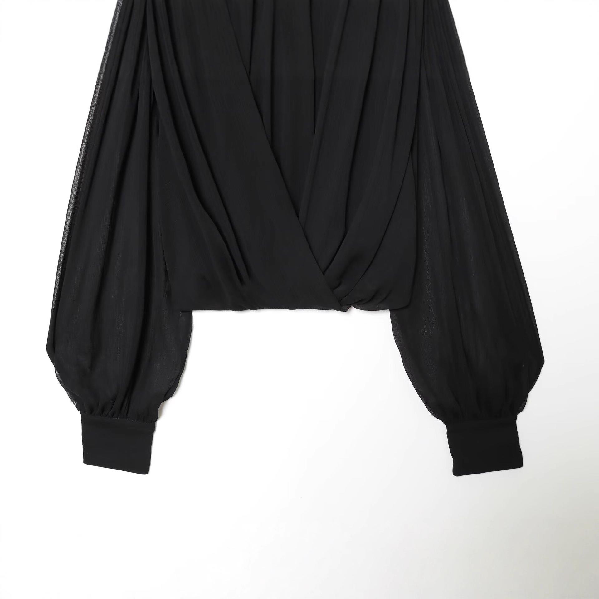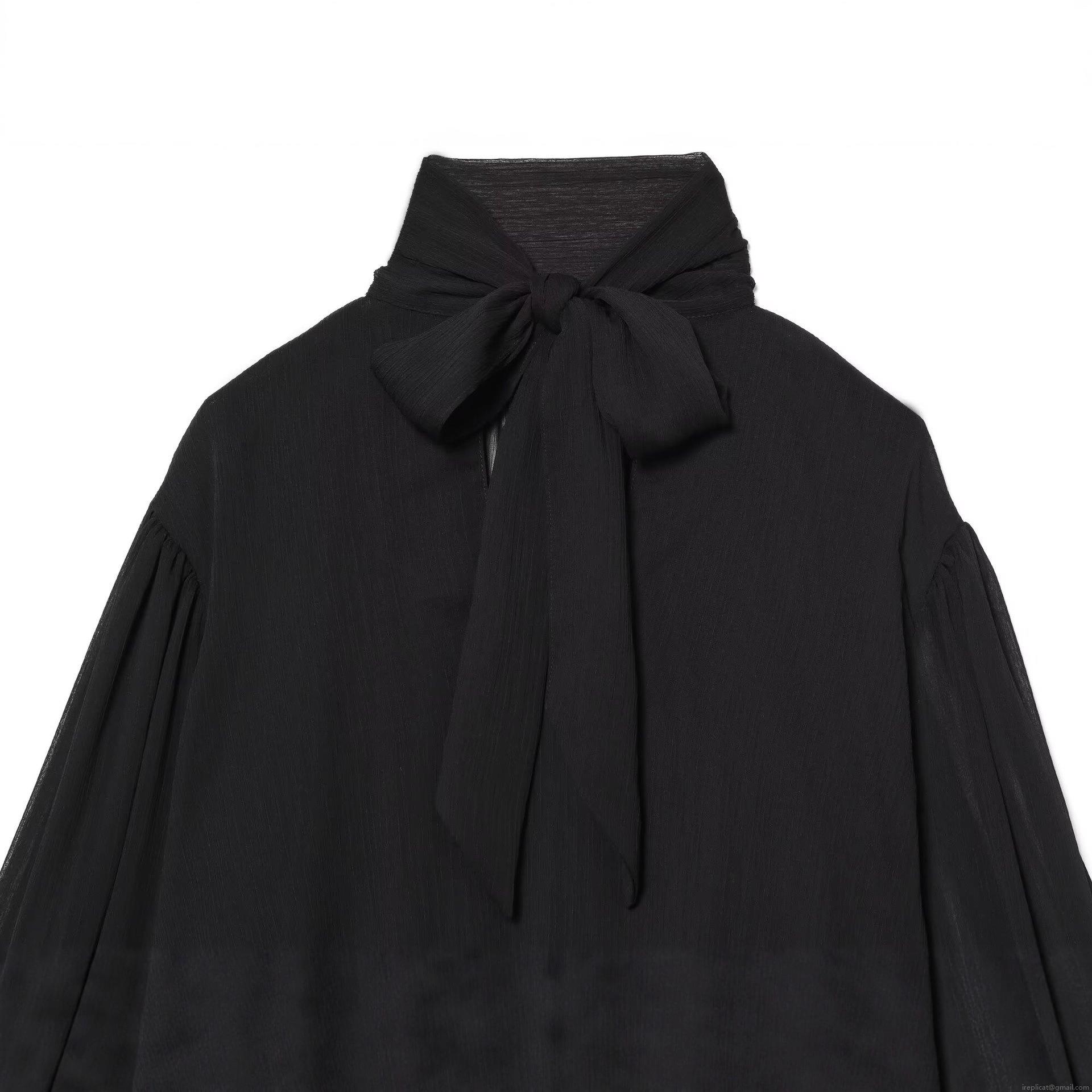 • Women's Elegant Black Pleated Chiffon Blouse Sheer Long Sleeve Tie Neck Bow Shirt Streetwear Party Tops