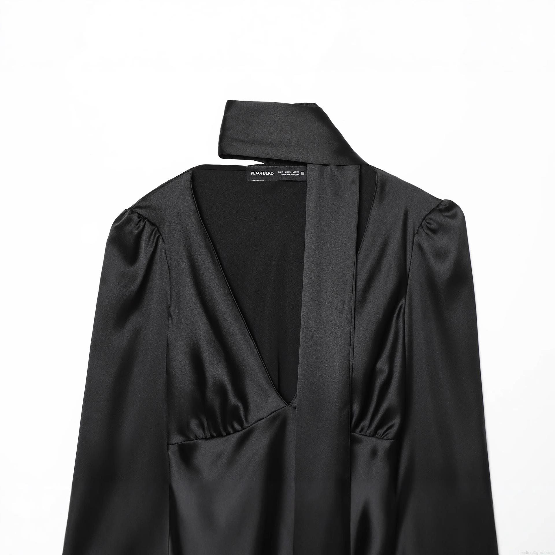 Women's Elegant Black Satin Blouse Scarf Tie Neck Long Sleeve V-Neck Shirt Fashion Silk Texture Solid Color Office Party Chic Top Acetate Lady Clothing