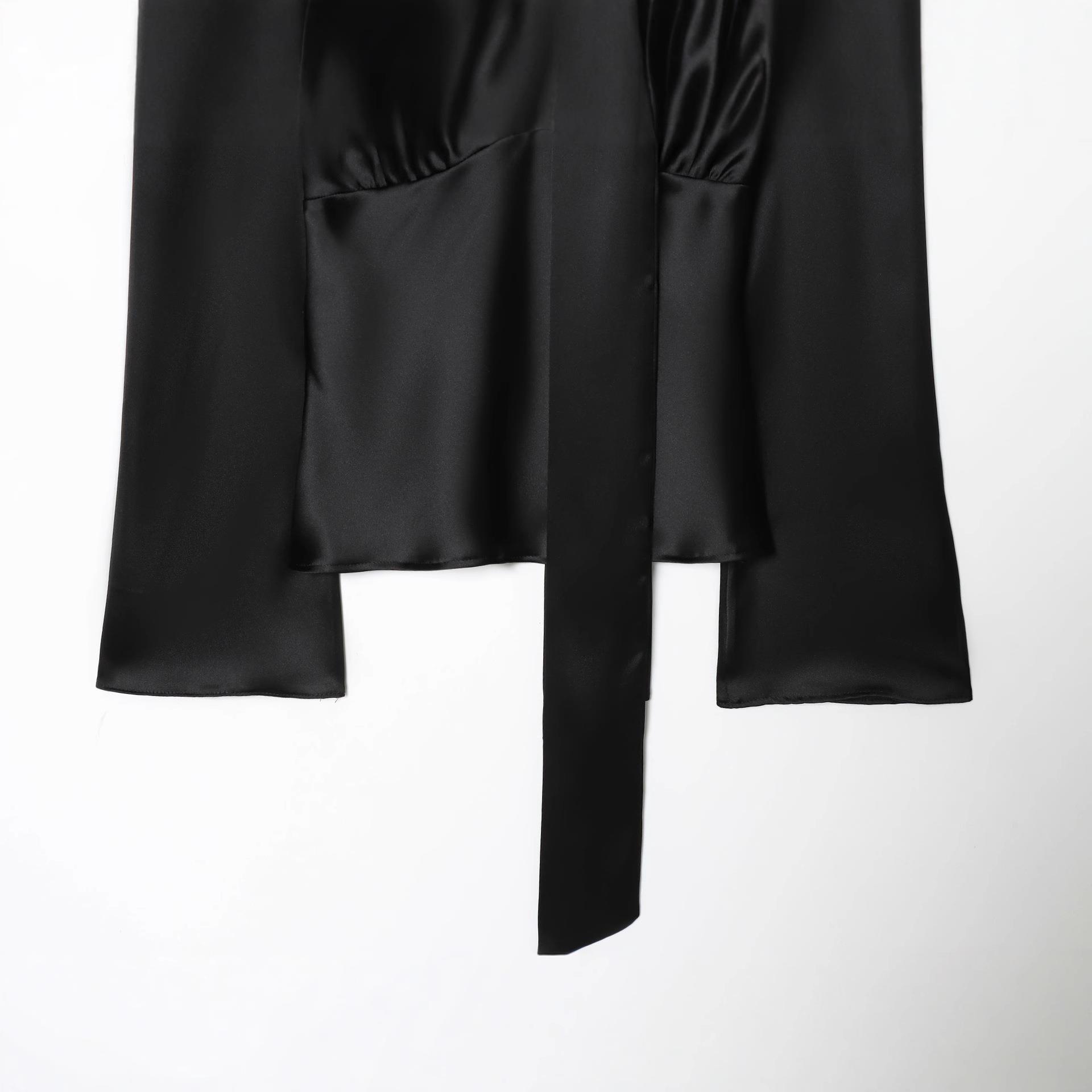 • Women's Elegant Black Satin Blouse Scarf Tie Neck Long Sleeve V-Neck Shirt Fashion Silk Texture Solid Color Office Party Chic Top Acetate Lady Clothing