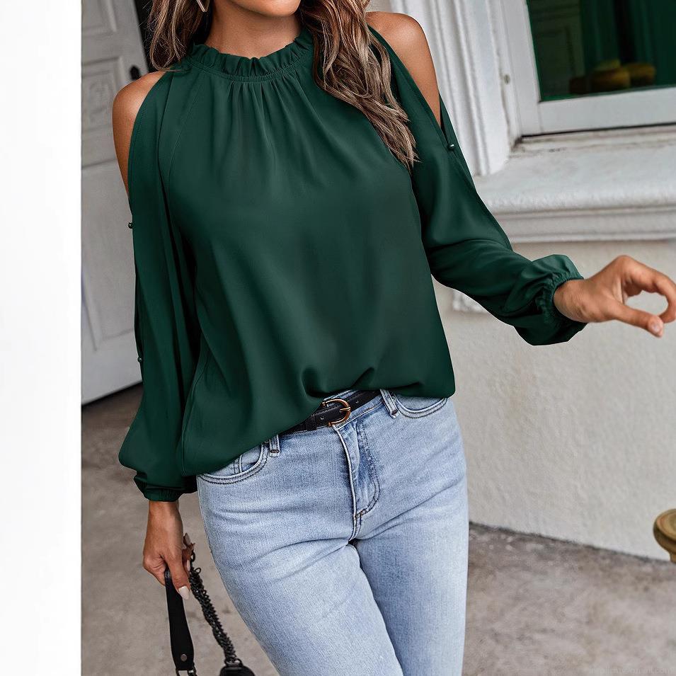 • Women's Elegant Chiffon Blouse Cold Shoulder Frill High Neck Long Sleeve Solid Color Fashion Tops For Commuter Party
