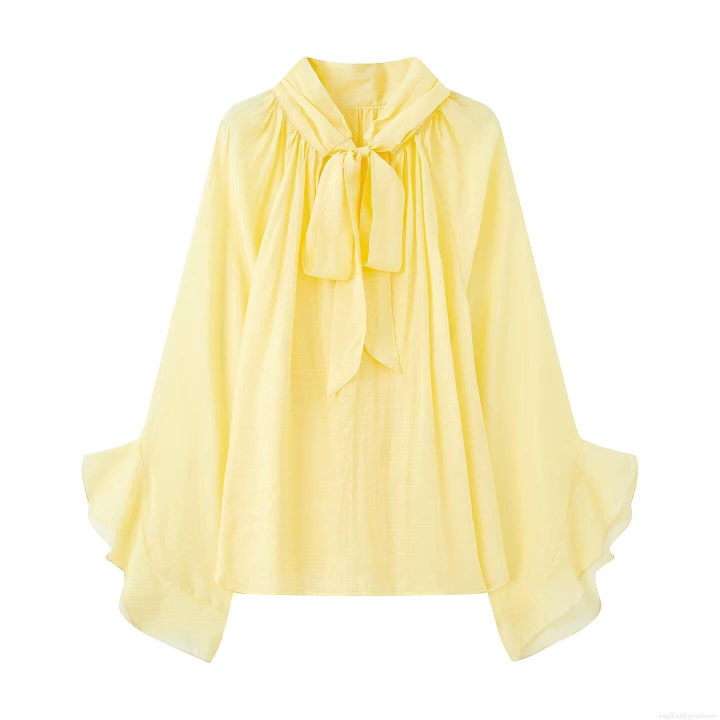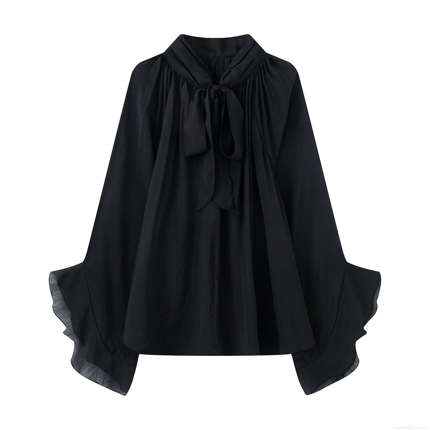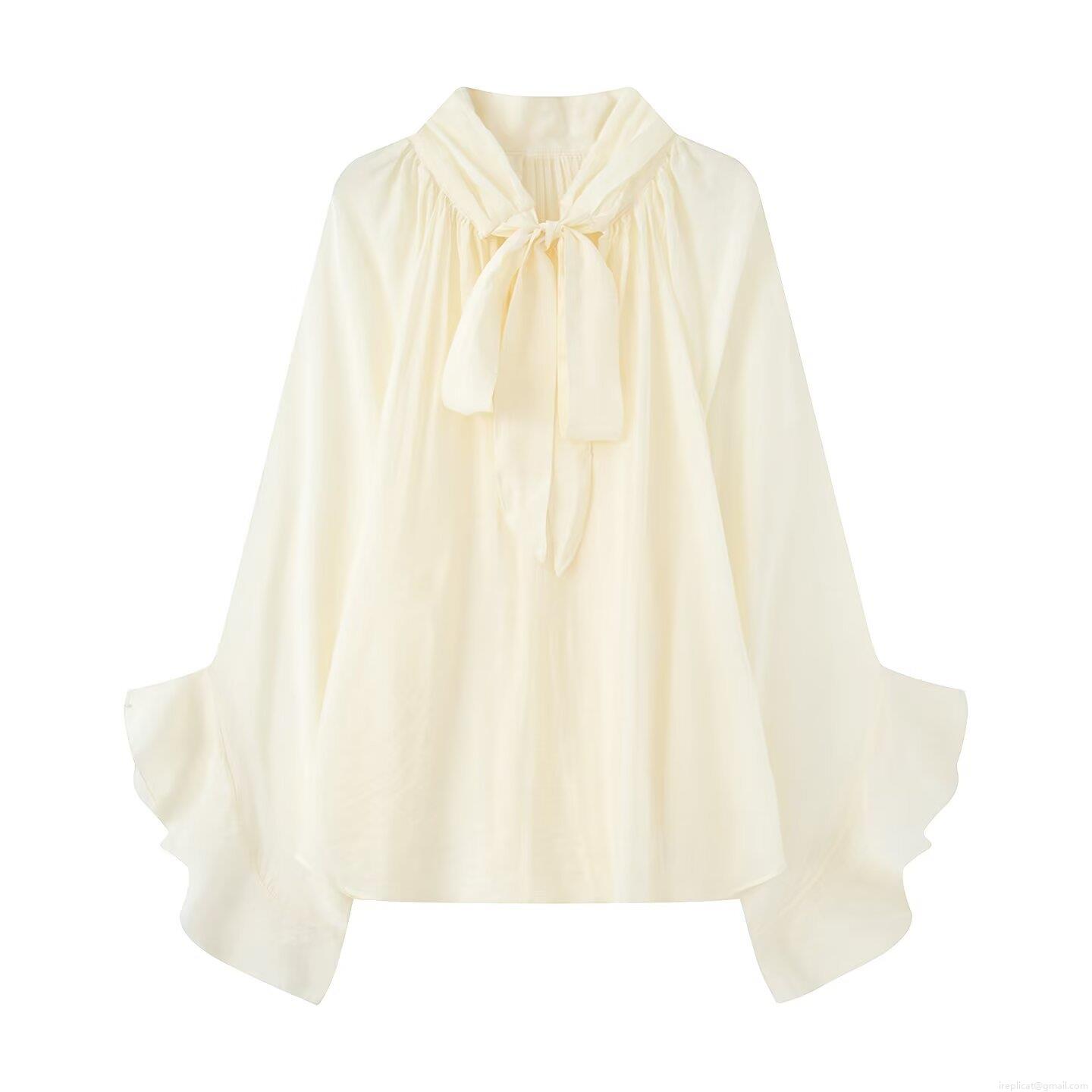 • Women's Elegant Chiffon Blouse Long Sleeve Bow Tie Neck Ruffled Flared Sleeve Solid Color Pleated Loose Top For Party Office Lady
