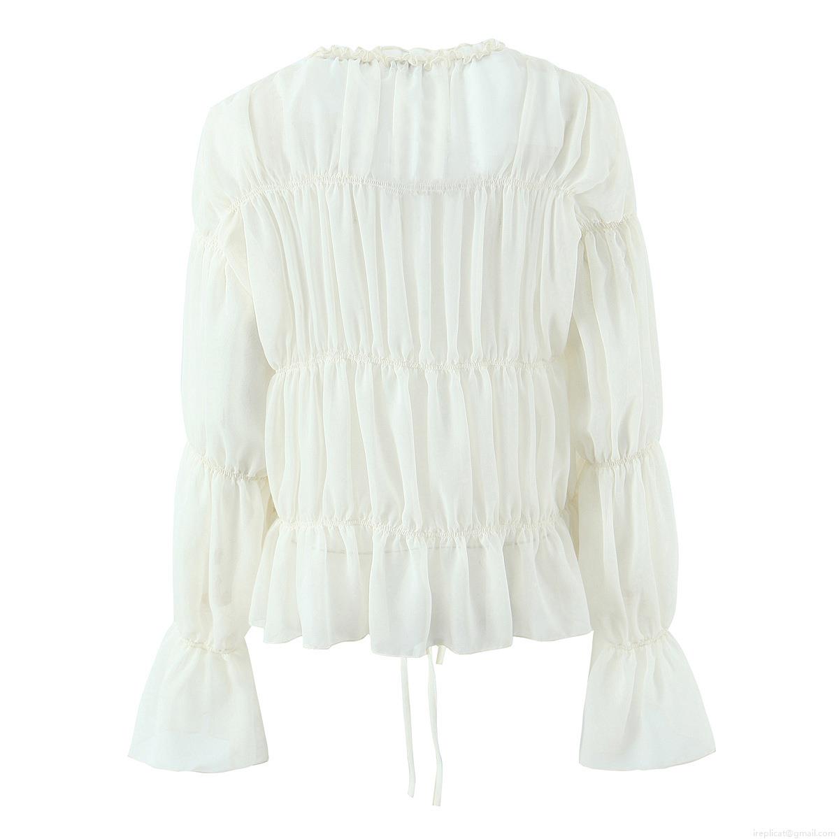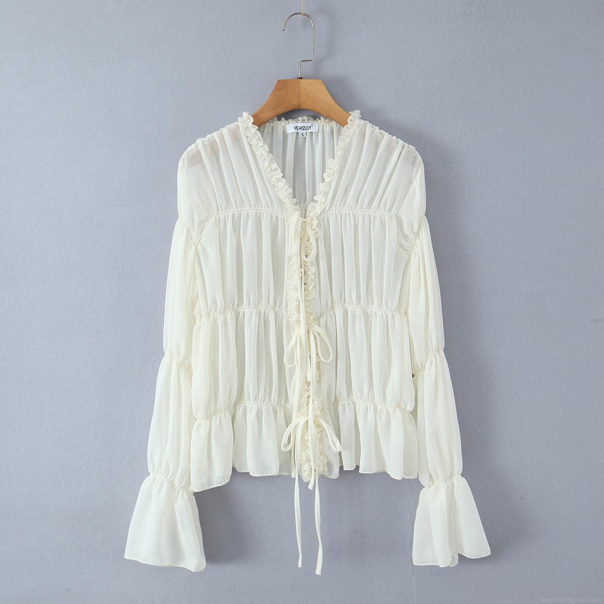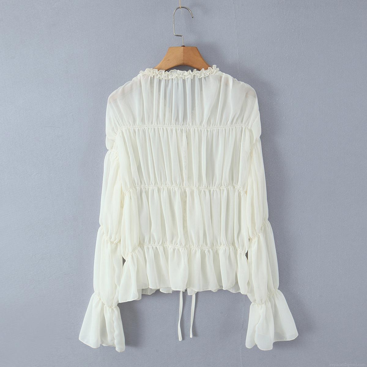 • Women's Elegant Chiffon Blouse Ruffle Pleated Tie Front Long Sleeve Polyester Shirt Sweet Casual Solid Color Tops For Ladies