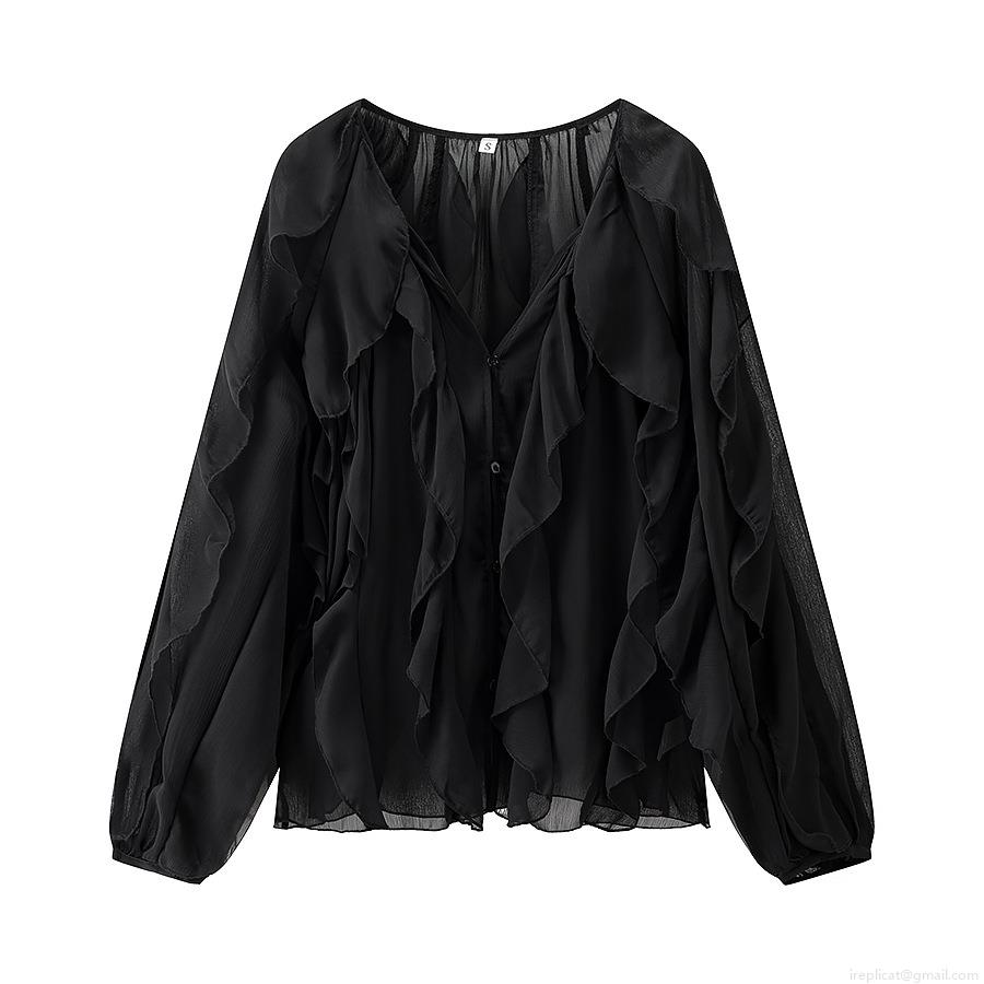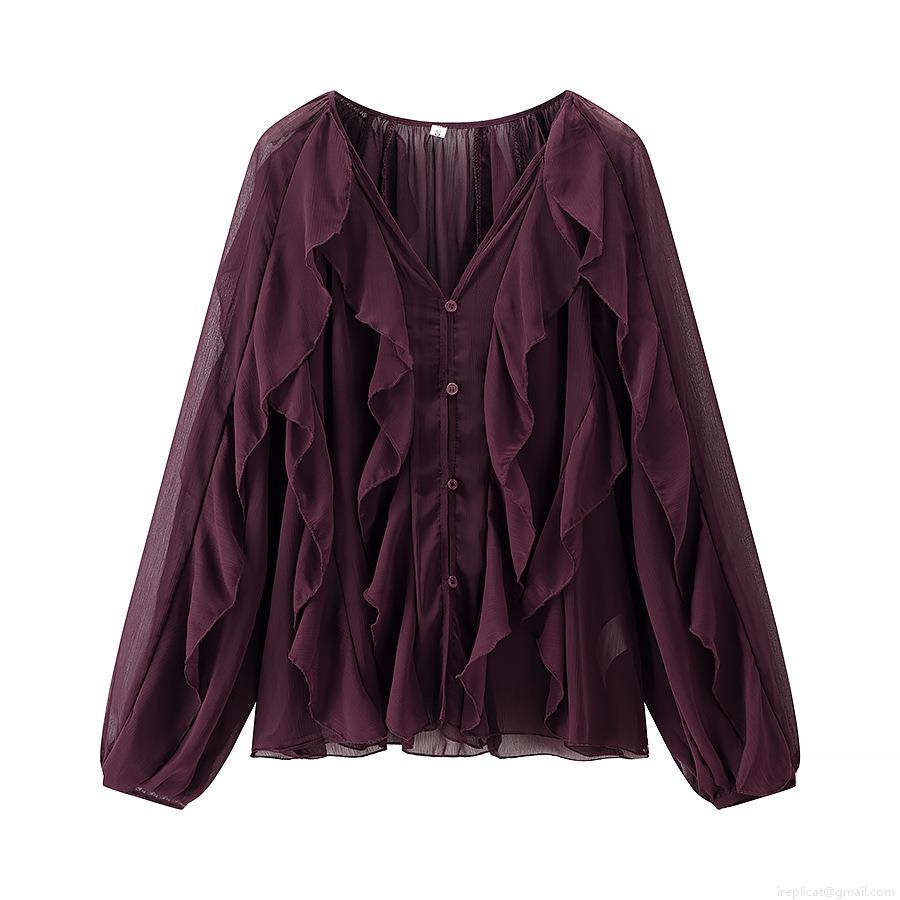 • Women's Elegant Chiffon Tiered Ruffle Blouse V-Neck Long Sleeve Bow-Tie Single-Breasted Loose Fit Polyester Shirt Summer Streetwear Top