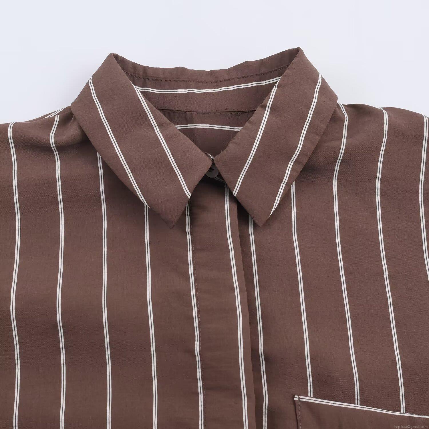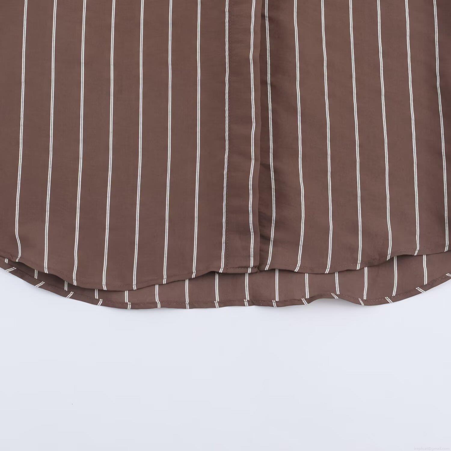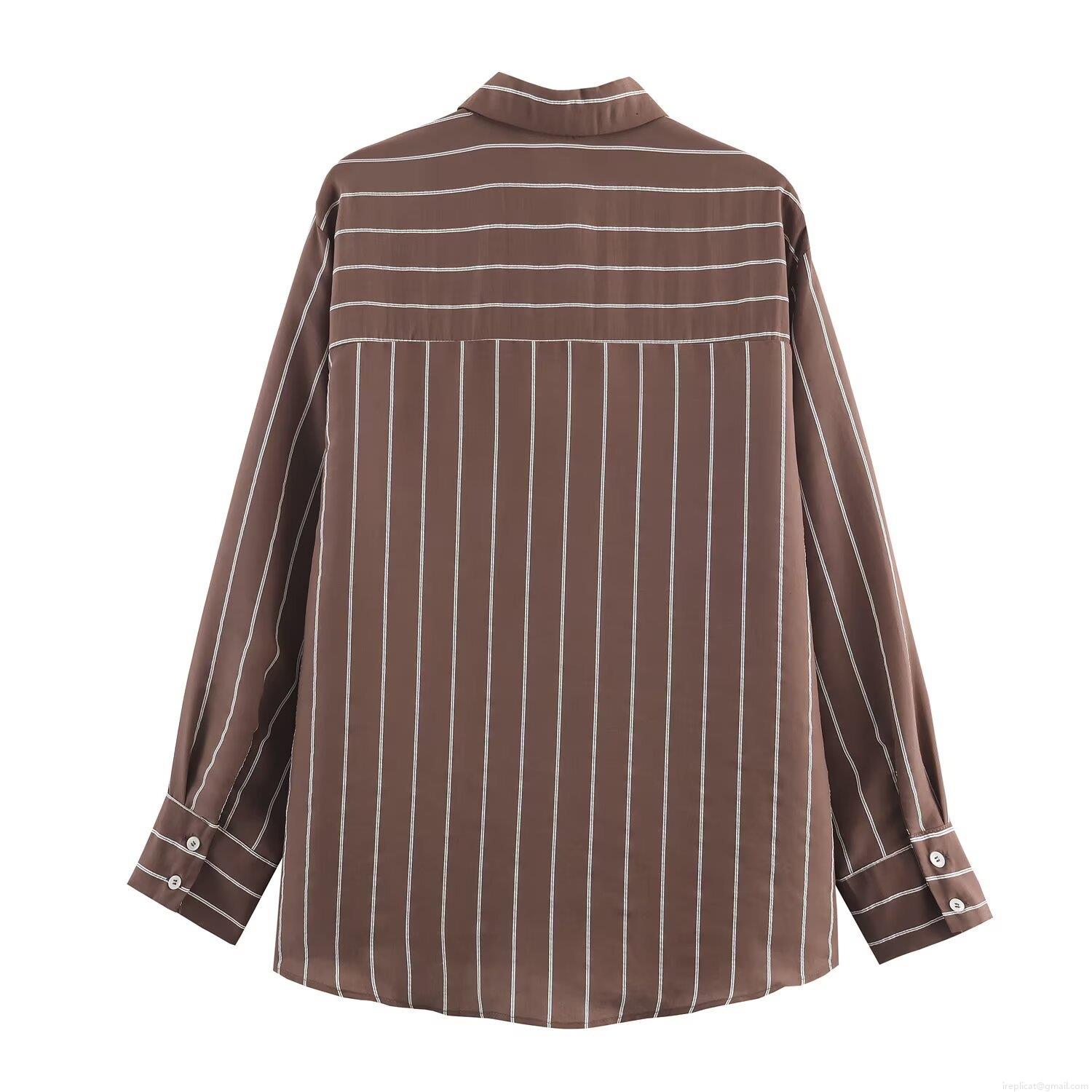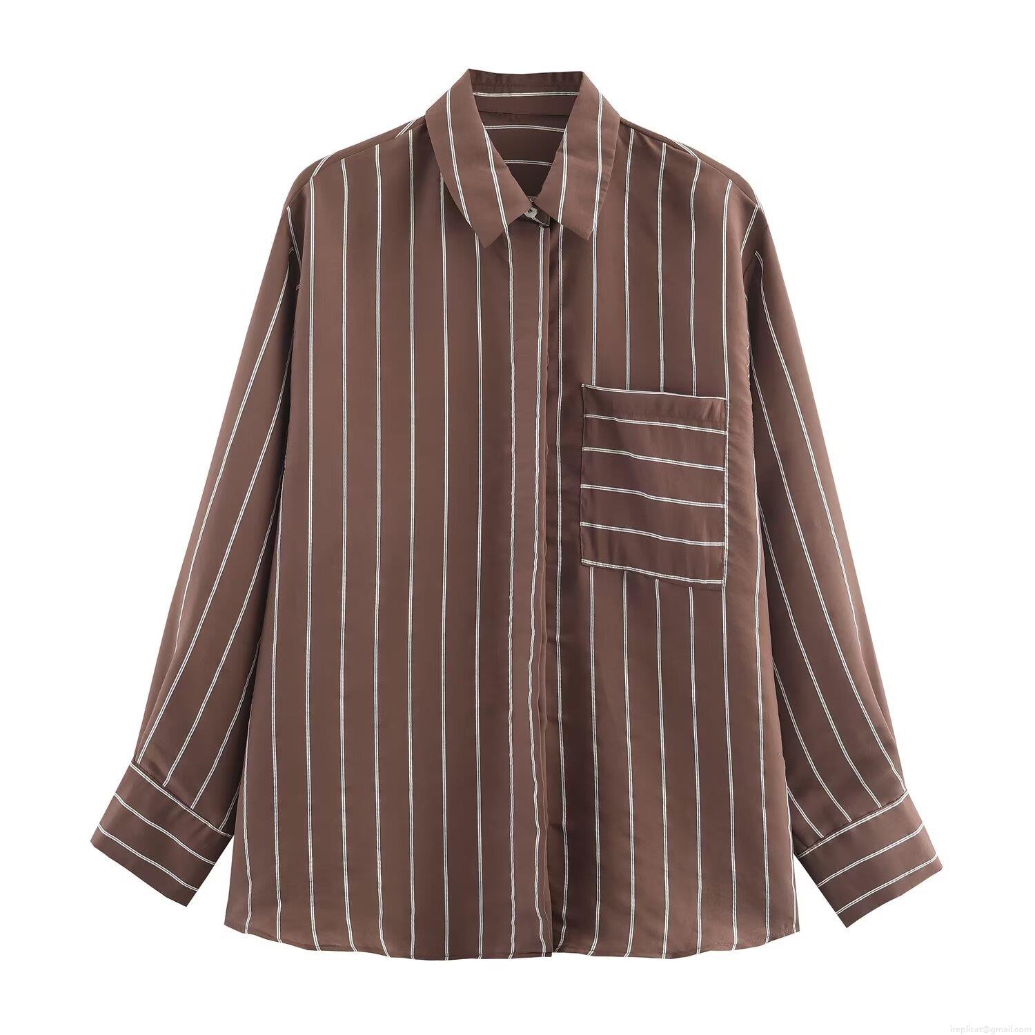 • Women's Elegant Coffee White Striped Long Sleeve Shirt With Single Pocket Chic Polyester Button Down Blouse For Casual Daily Office Wear