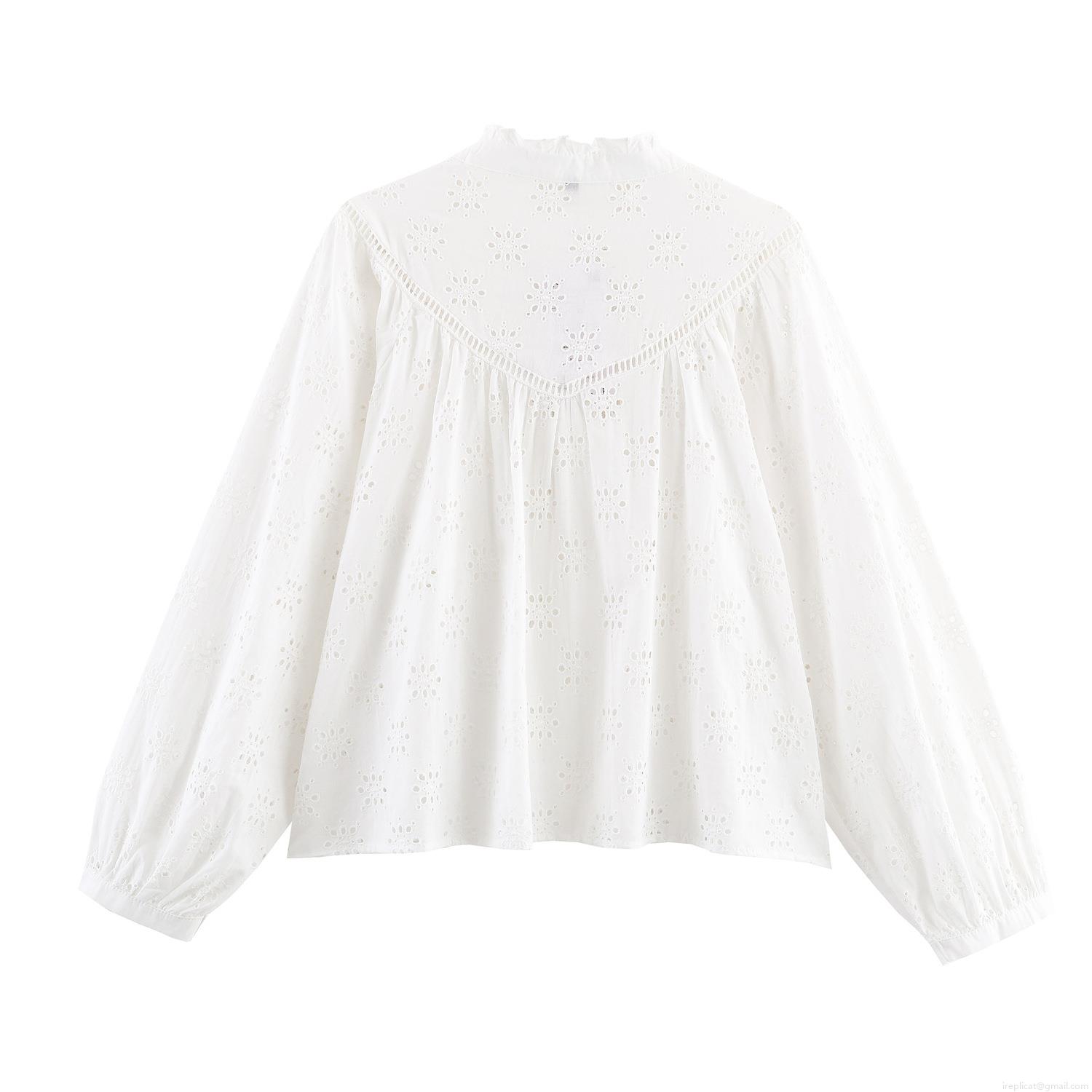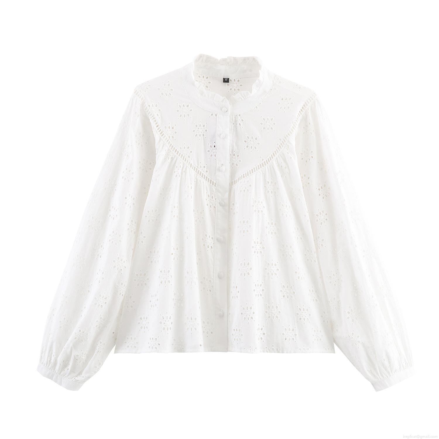• Women's Elegant Cotton Blend Eyelet Embroidery Blouse Ruffle Collar Long Lantern Sleeve Button Down Shirt Sweet Casual Hollow Out Top For Daily Date Party