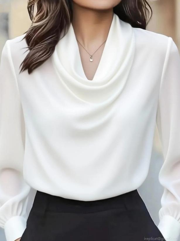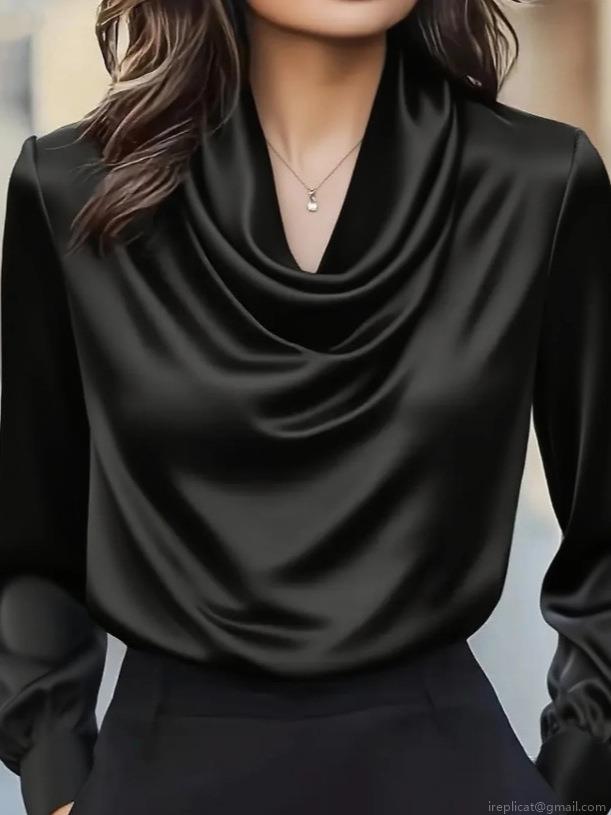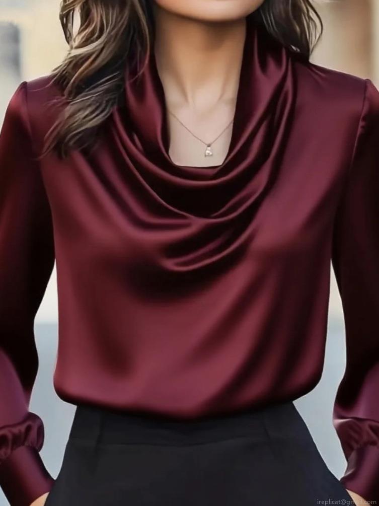 • Women's Elegant Cowl Neck Satin Blouse Fashion Long Sleeve Solid Color Polyester Spandex Pullover Shirt For Office Commute Party Ladies Fashion Tops