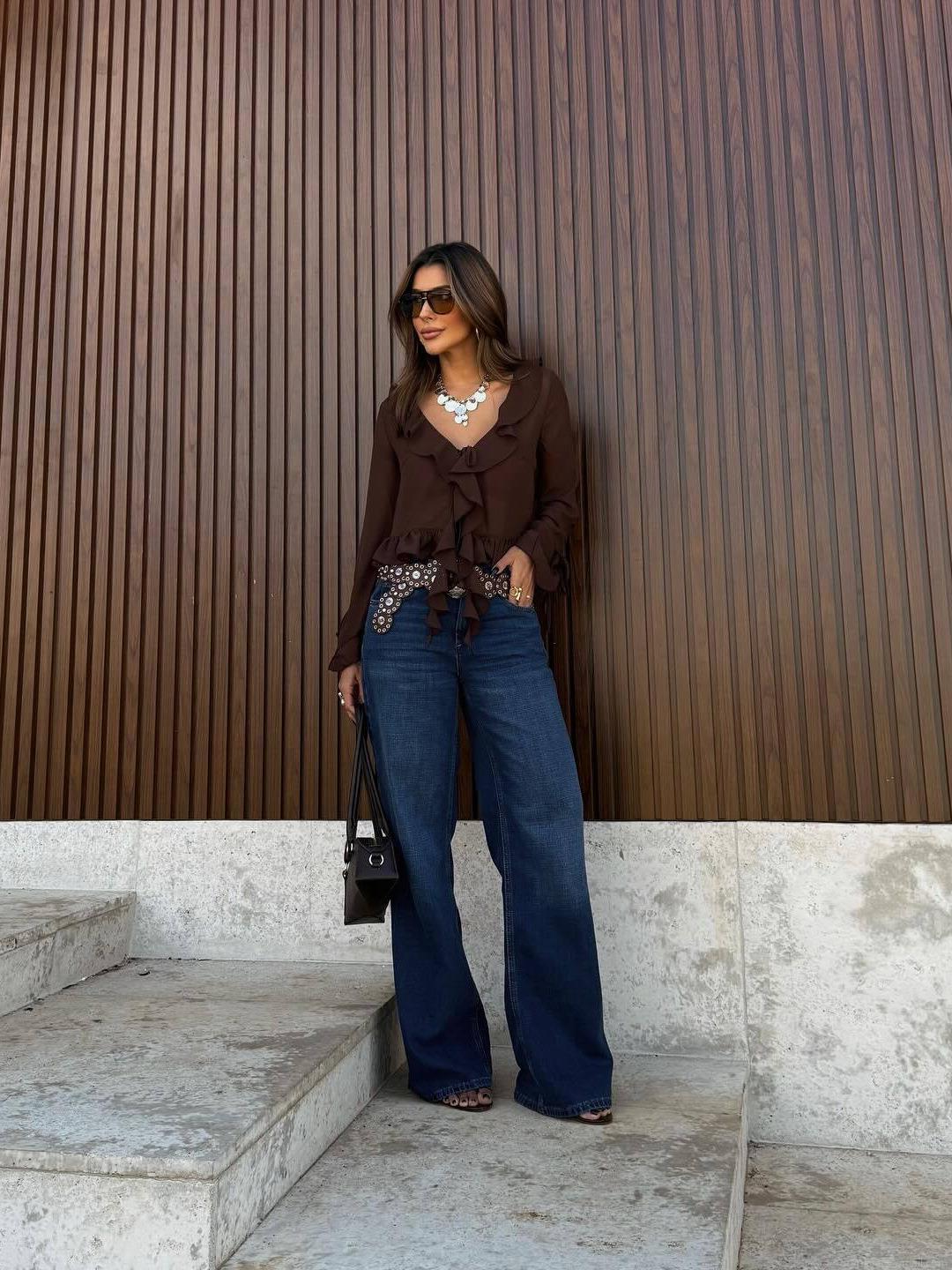 • Women's Elegant Deep Brown Chiffon Blouse V-Neck Ruffle Edge Long Sleeve Tie Cuff Top Casual Office Commuter Loose Fashion Shirt
