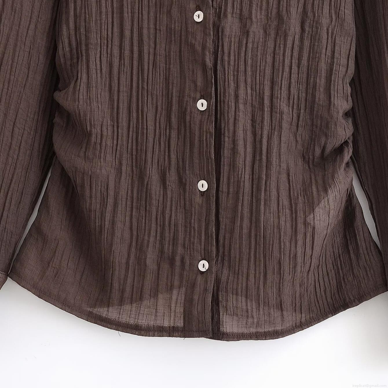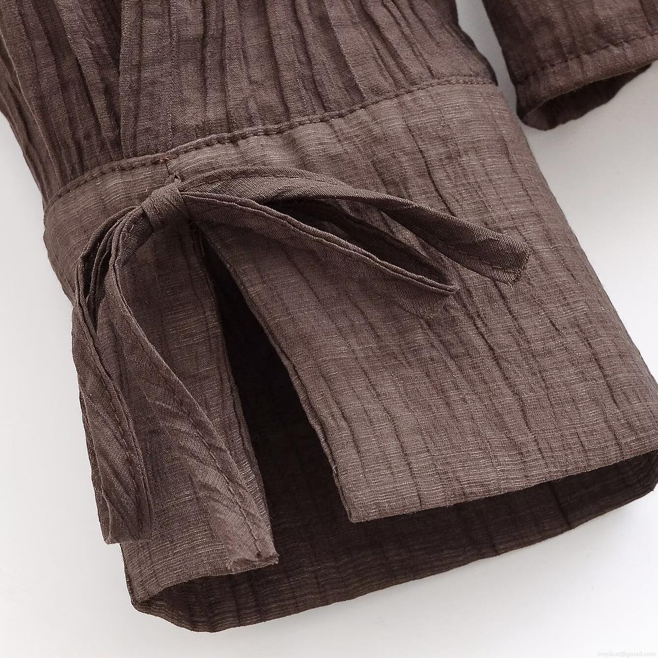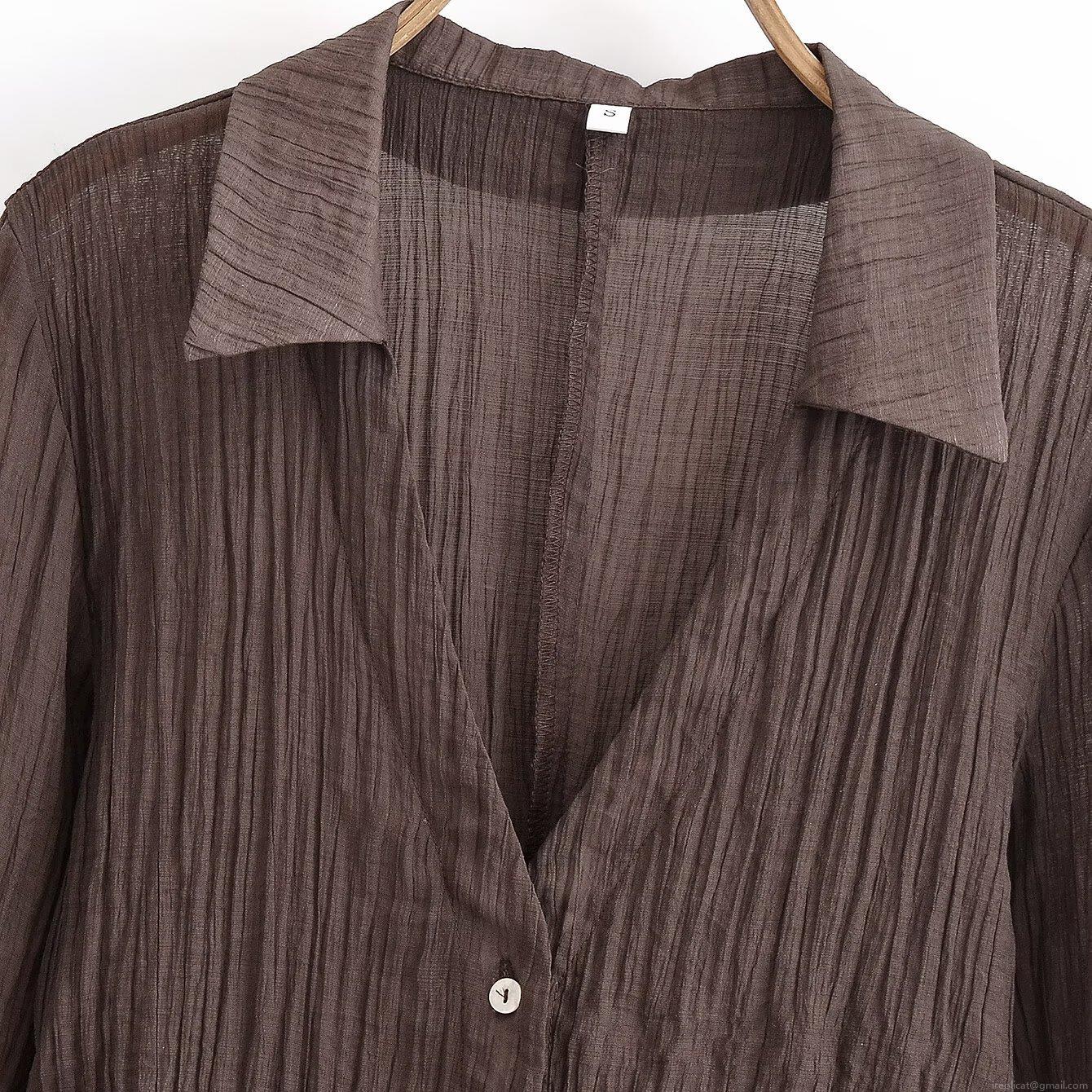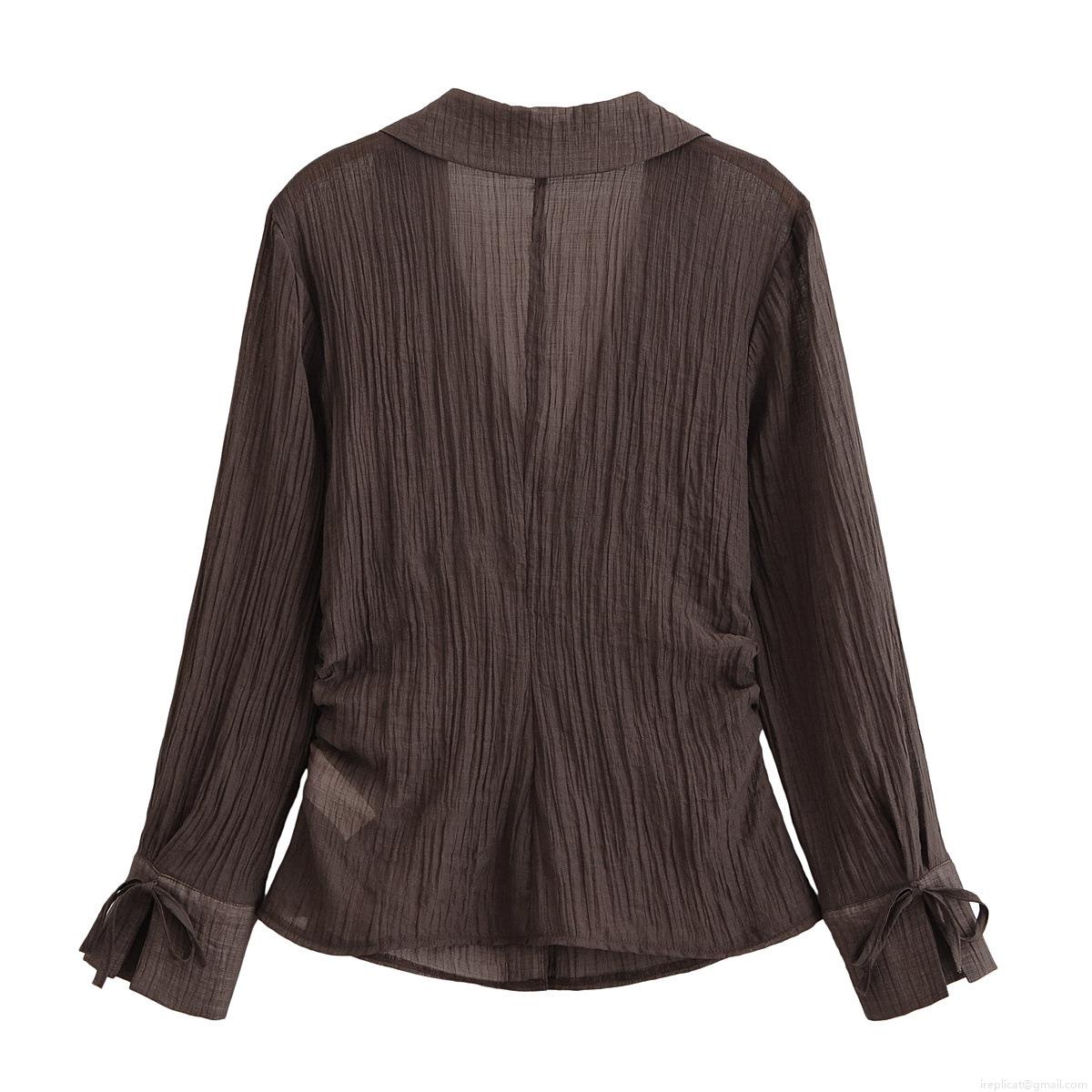 • Women's Elegant Deep Brown Pleated Blouse 100% Polyester V-Neck Long Sleeve Shirt With Bow Tie Cuffs Slim Fit Casual Top For Daily Commute