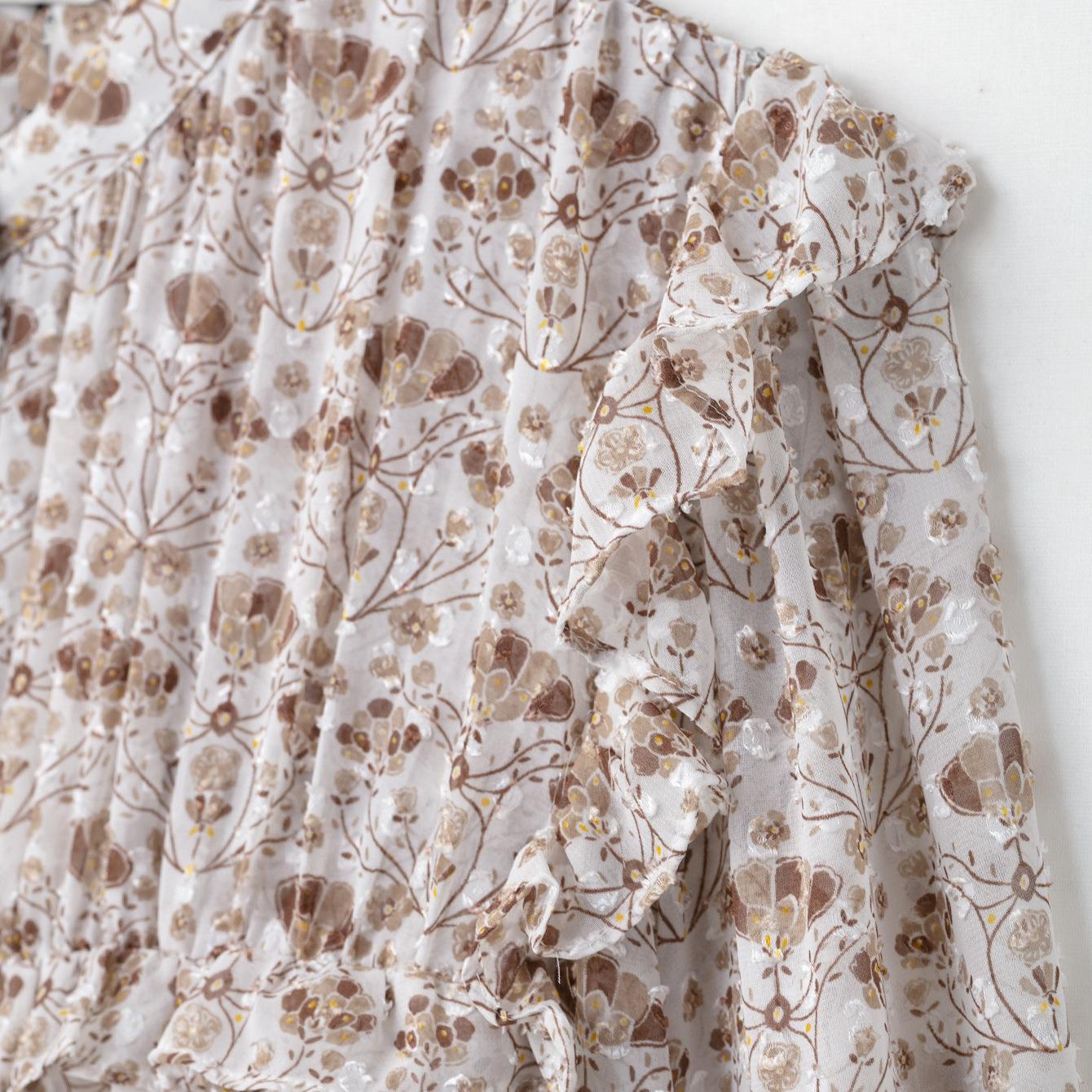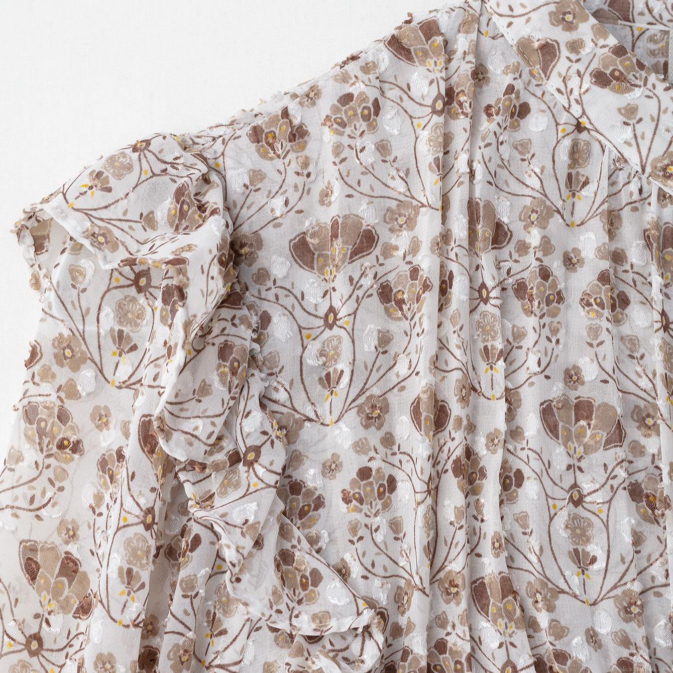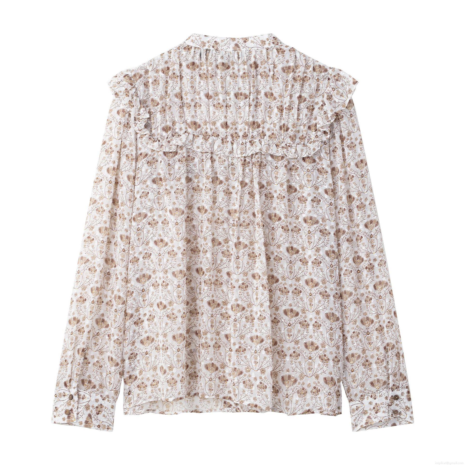 • Women's Elegant Floral Chiffon Blouse Ruffle Trim Stand Collar Long Sleeve Shirt Vintage Office Daily Casual Sheer Texture Tops With Wood Buttons