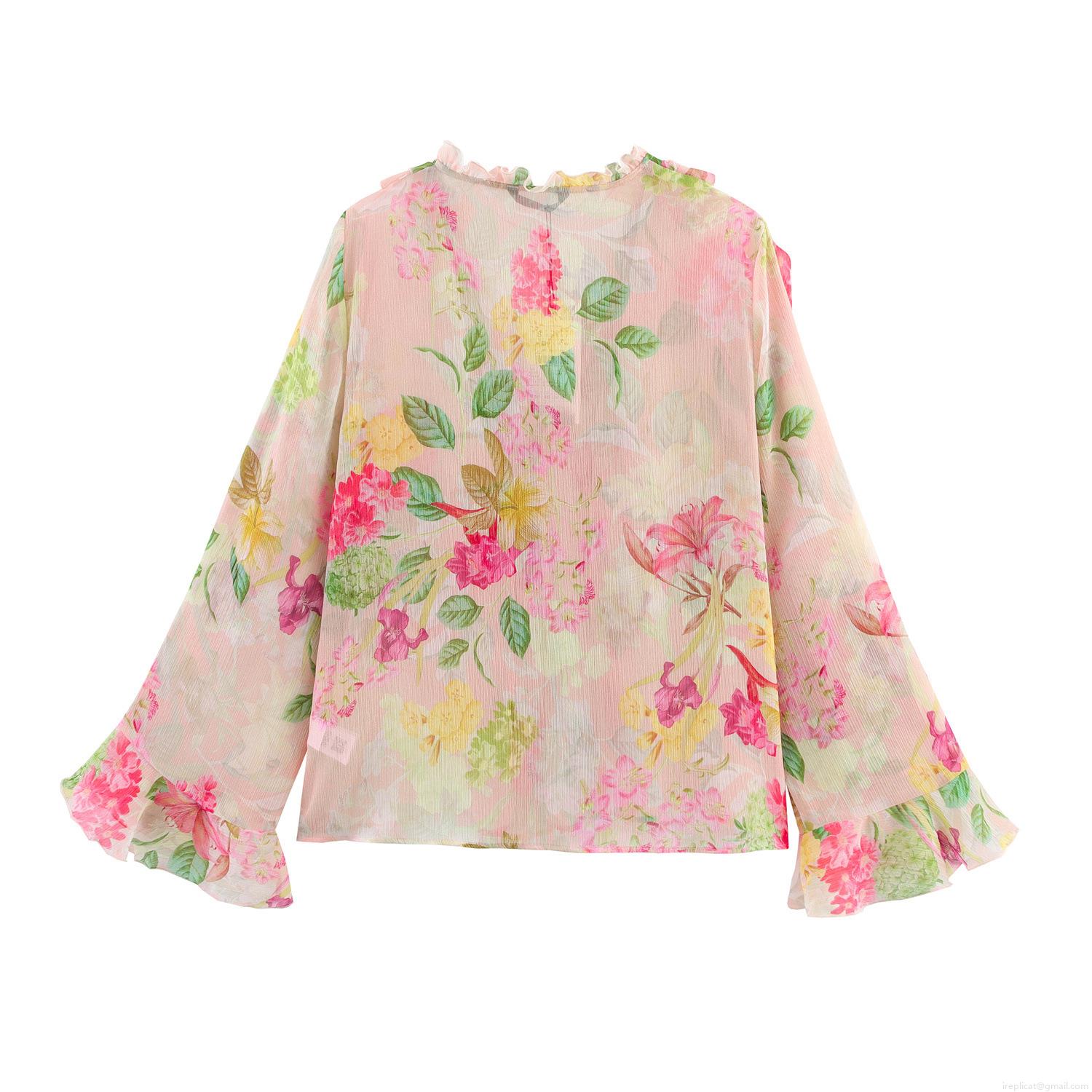 • Women's Elegant Floral Chiffon Blouse V Neck Layered Ruffles Long Flare Sleeve Pullover Top For Casual Dating Women Pink