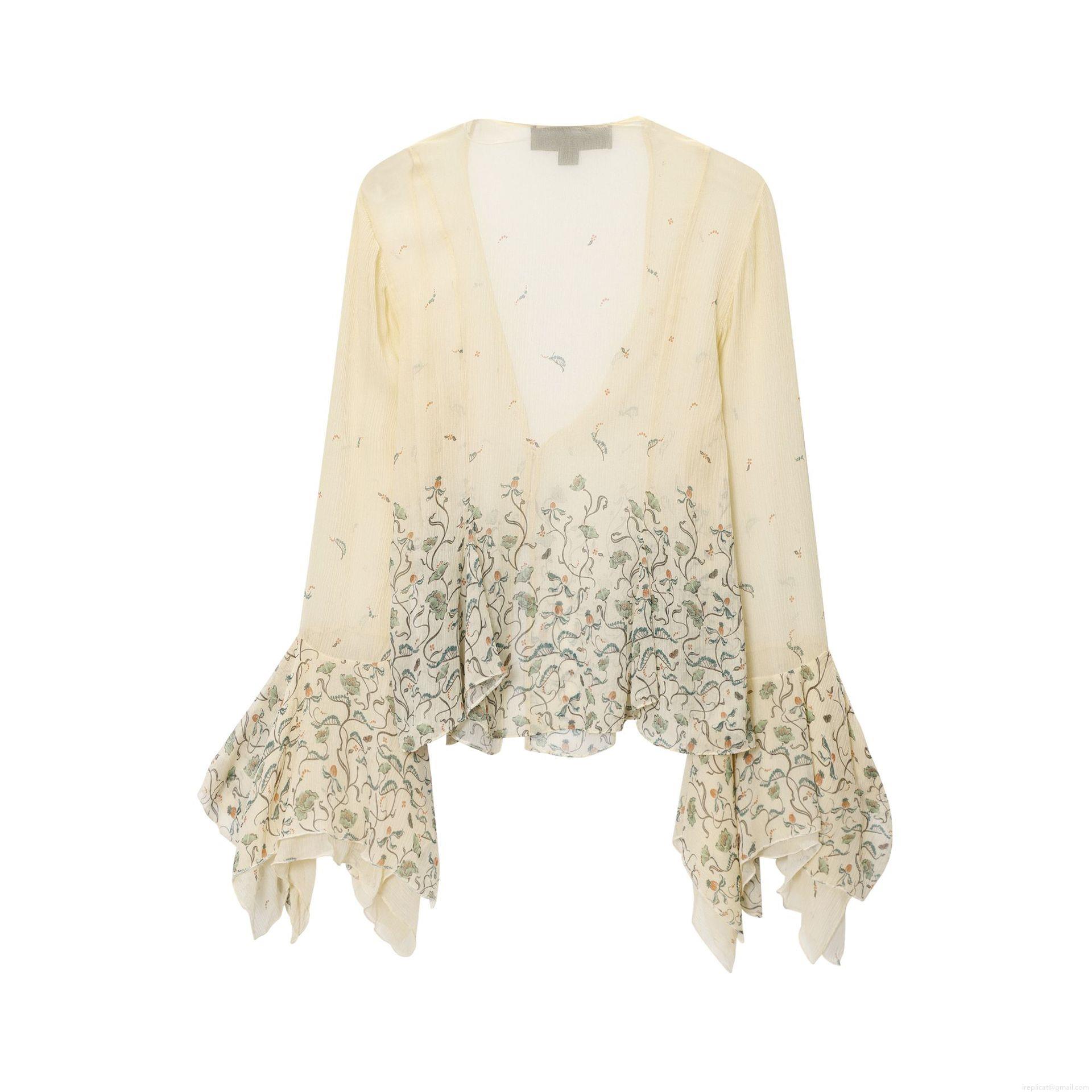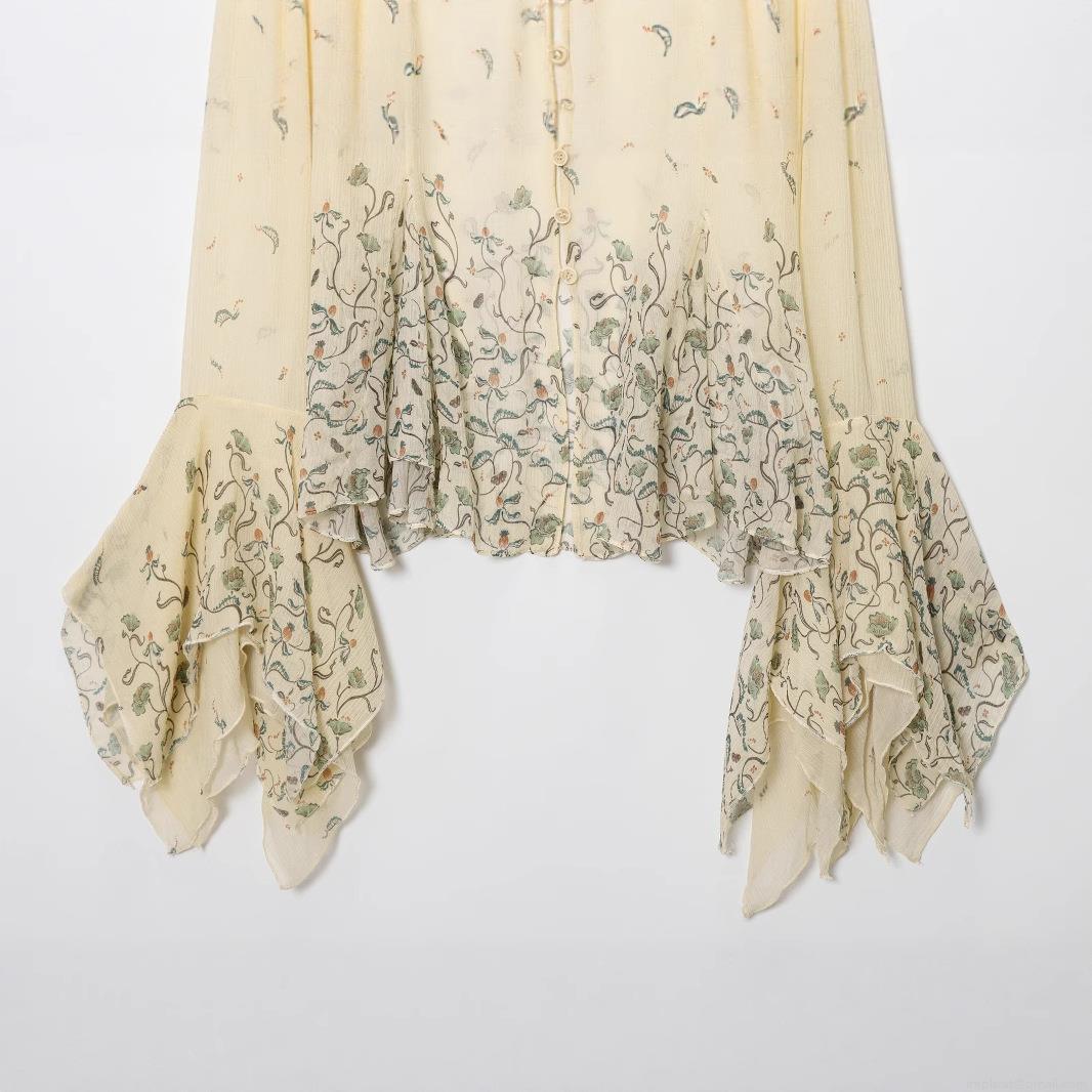 • Women's Elegant Floral Print Chiffon Blouse V-Neck Long Flared Sleeve Ruffle Hem Pullover Shirt Casual Beige Polyester Tops For Women
